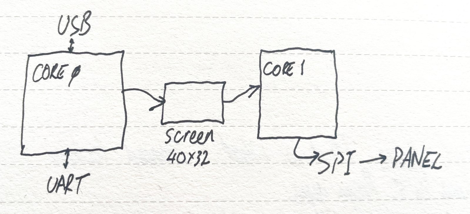 The second core reads from this in-memory screen, does the math to figure out the pixels, and writes this data over SPI (using the RP2040’s awesome DMA) to the display.