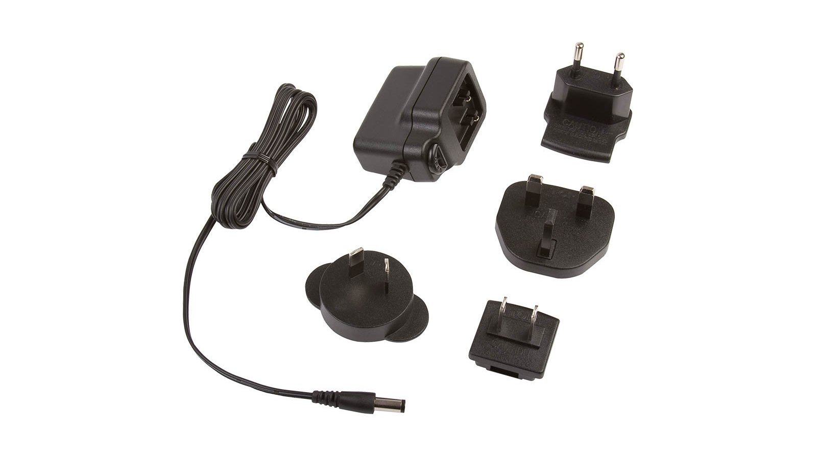 A 12 V, 1 A (12 W) AC adapter with interchangeable plugs provided for the US, EU, AU, UK, plus a CCC-compliant plug - connecting via a 2.1 mm center-positive barrel jack.