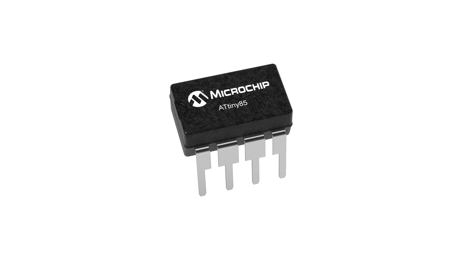 A 20 MHz, 8-bit, 8-pin DIP AVR MCU with 6 I/O, 1 KiB flash, 64 B SRAM, 64 B EEPROM, a SPI interface, and an input voltage range of 1.8 - 5.5 V.