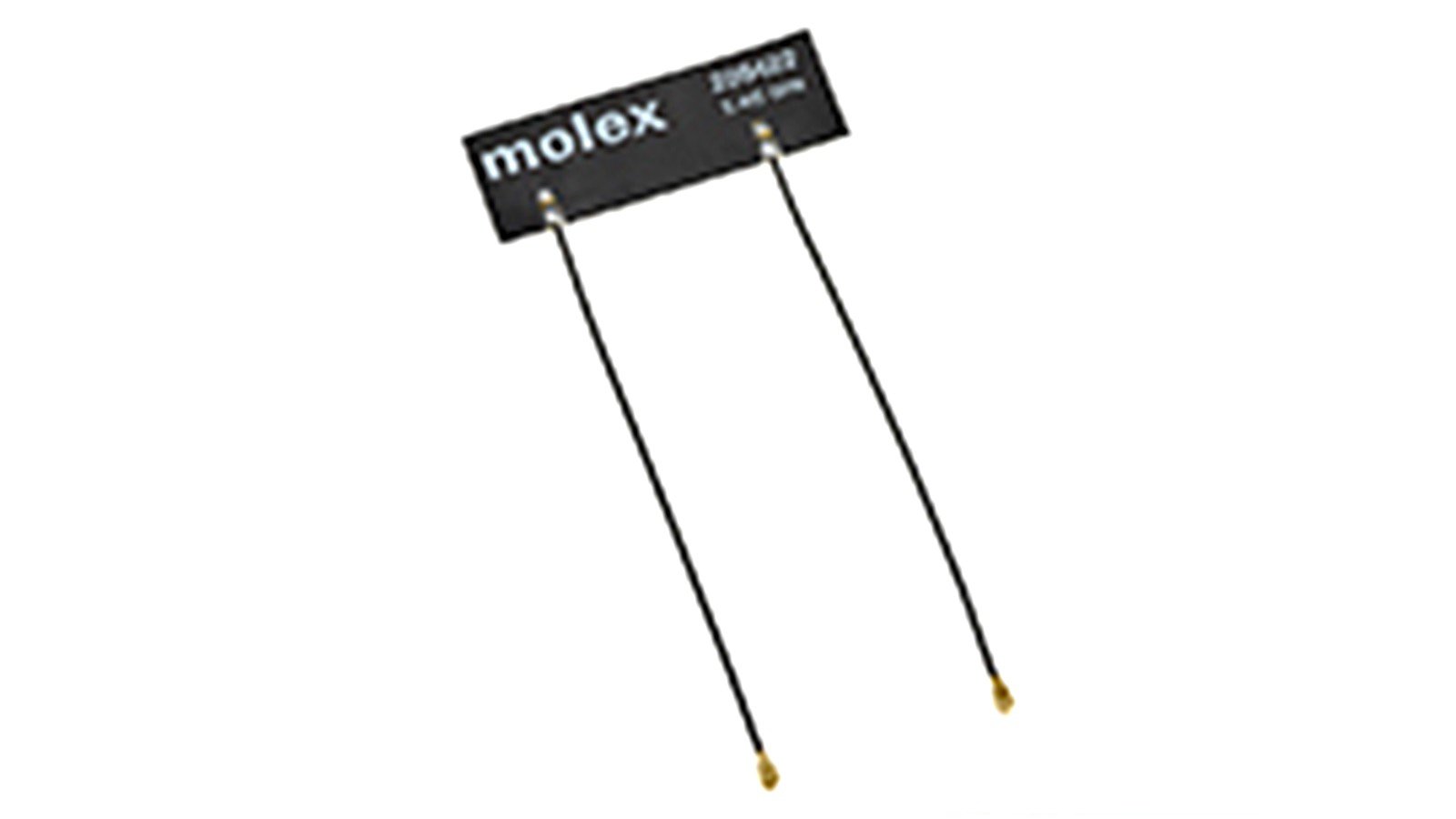 A Molex 208482-0100 flexible-PCB 2x2 MIMO Wi-Fi (2.4/5 GHz), BT, and Zigbee antenna with adhesive backing and I-PEX MHF connectors.