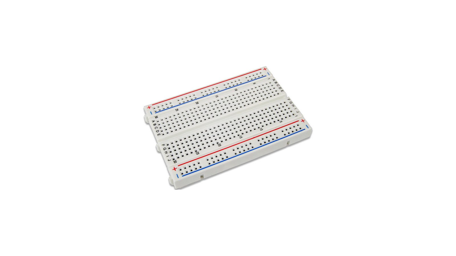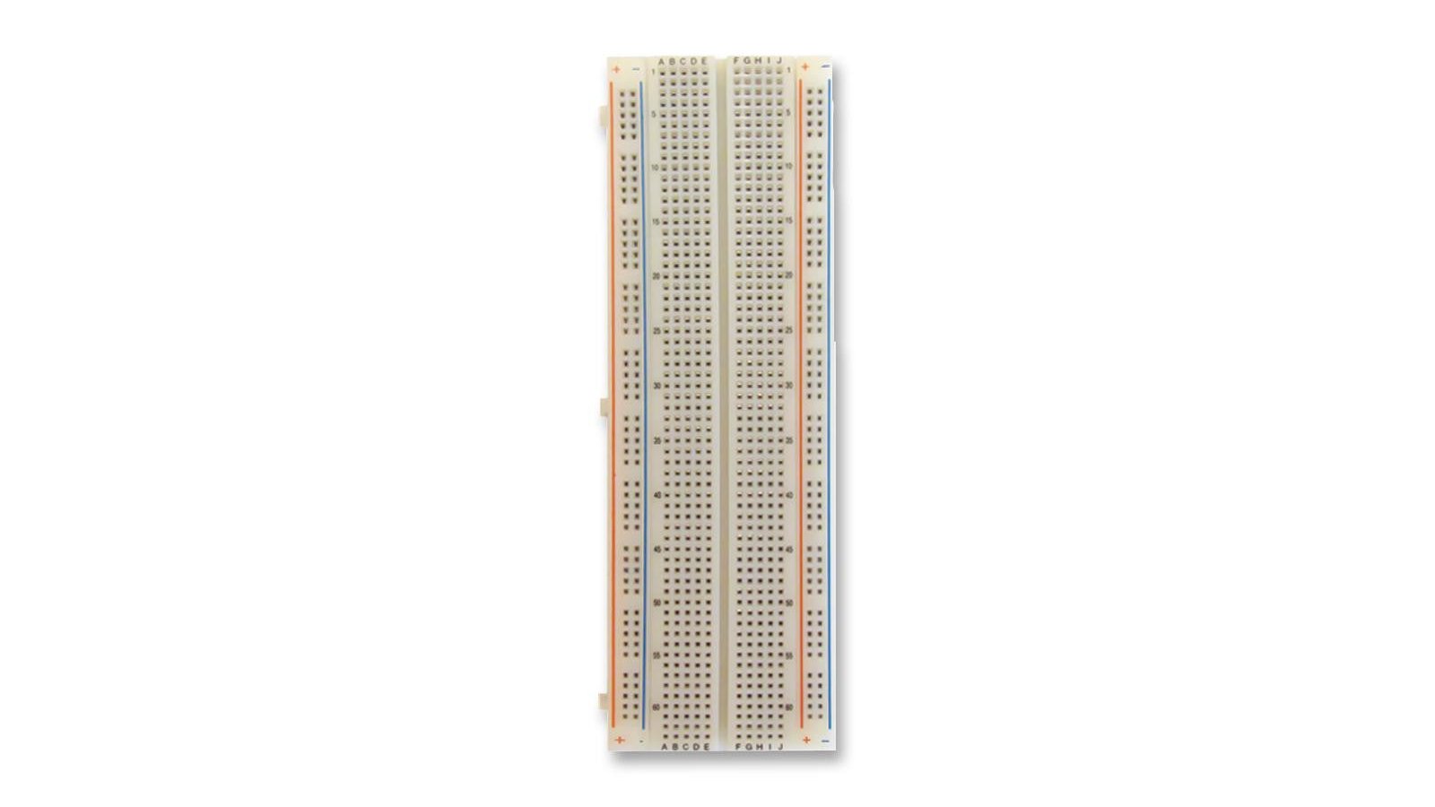 A half-size (3.25 x 2.125 in ~ 8.3 x 5.4 cm) breadboard with a self-adhesive backing