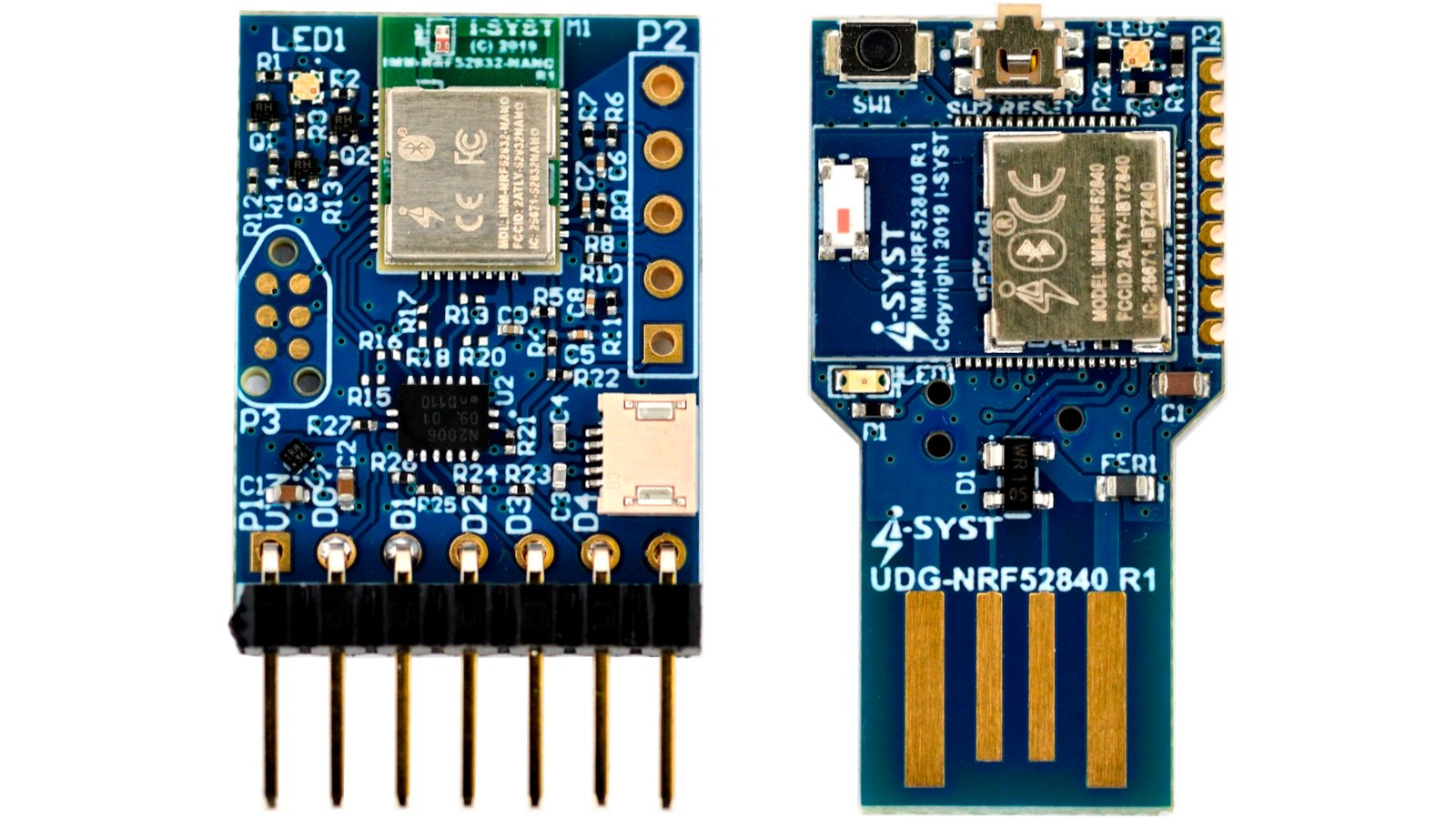 BlueIO832 Mini module, powered by Blyst Nano (nRF52832 microcontroller + BLE), preconfigured as a UART bridge, and paired with a UDG-NRF52840 USB Type-A adapter board