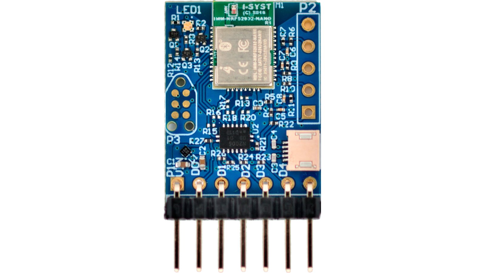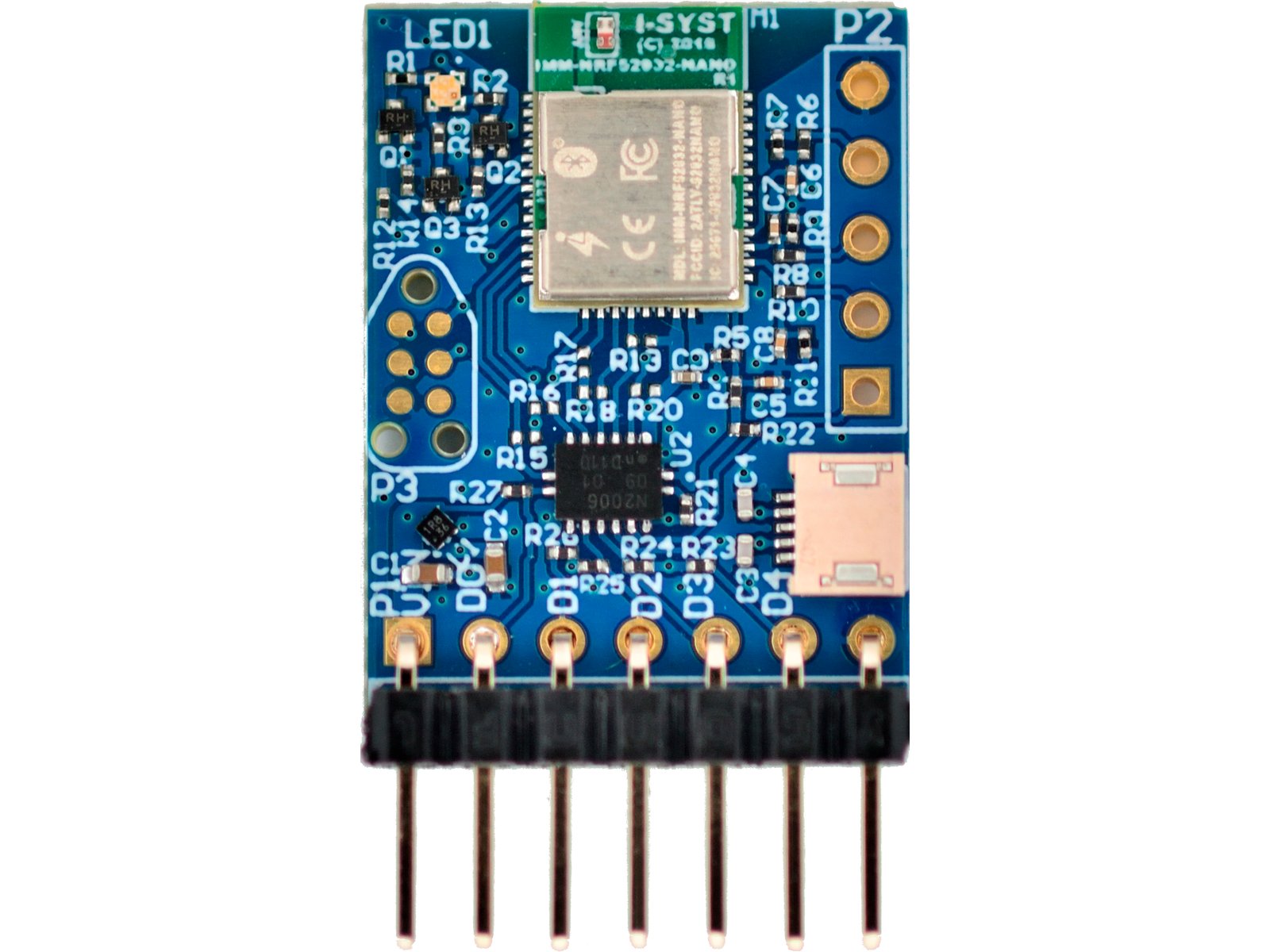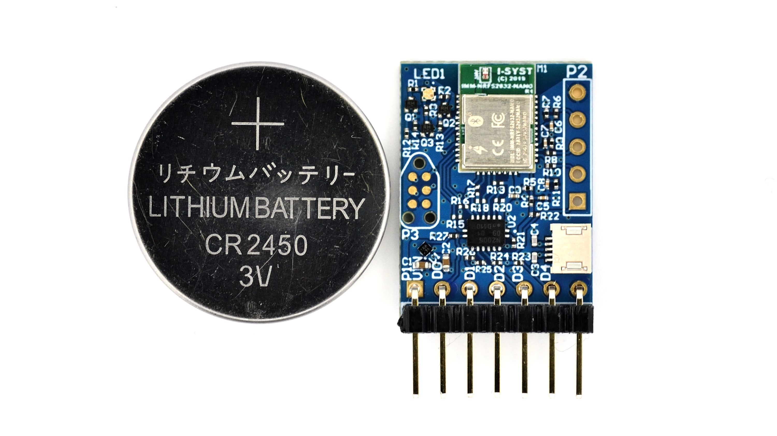 One BlueIO832-Mini module, powered by Blyst Nano (nRF52832 microcontroller + BLE)