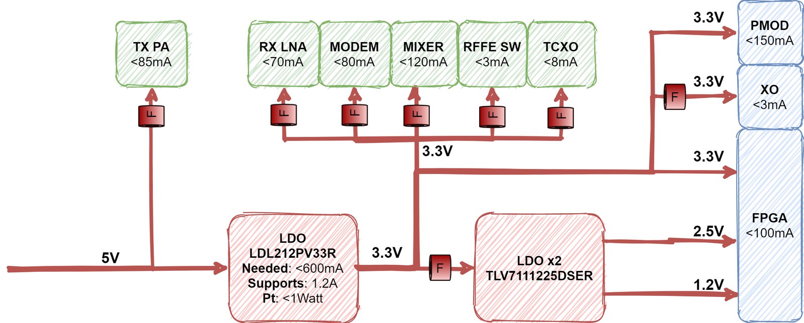 CaribouLite draws power through its 40-pin header from the Raspberry Pi’s 5 V rail. Those 5 V are used by the Tx-side RF amplifier after some filtering (full version only). A low-noise 3.3 V LDO is used to supply the board’s 3.3 V peripherals. An additional LDO down converts the 3.3 V to 2.5 V and 1.2 V voltages for the FPGA.