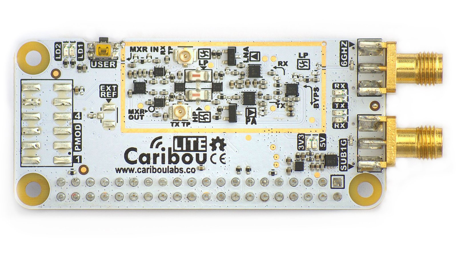 CaribouLite is an affordable, open-source, dual-channel software-defined radio (SDR) platform—and an SDR-focused FPGA development framework—implemented as a Raspberry Pi (RPi) HAT. CaribouLite turns your Raspberry Pi single-board computer (SBC) into a self-contained, dual-channel radio Tx/Rx that spans a wide tunable frequency spectrum up to 6 GHz.