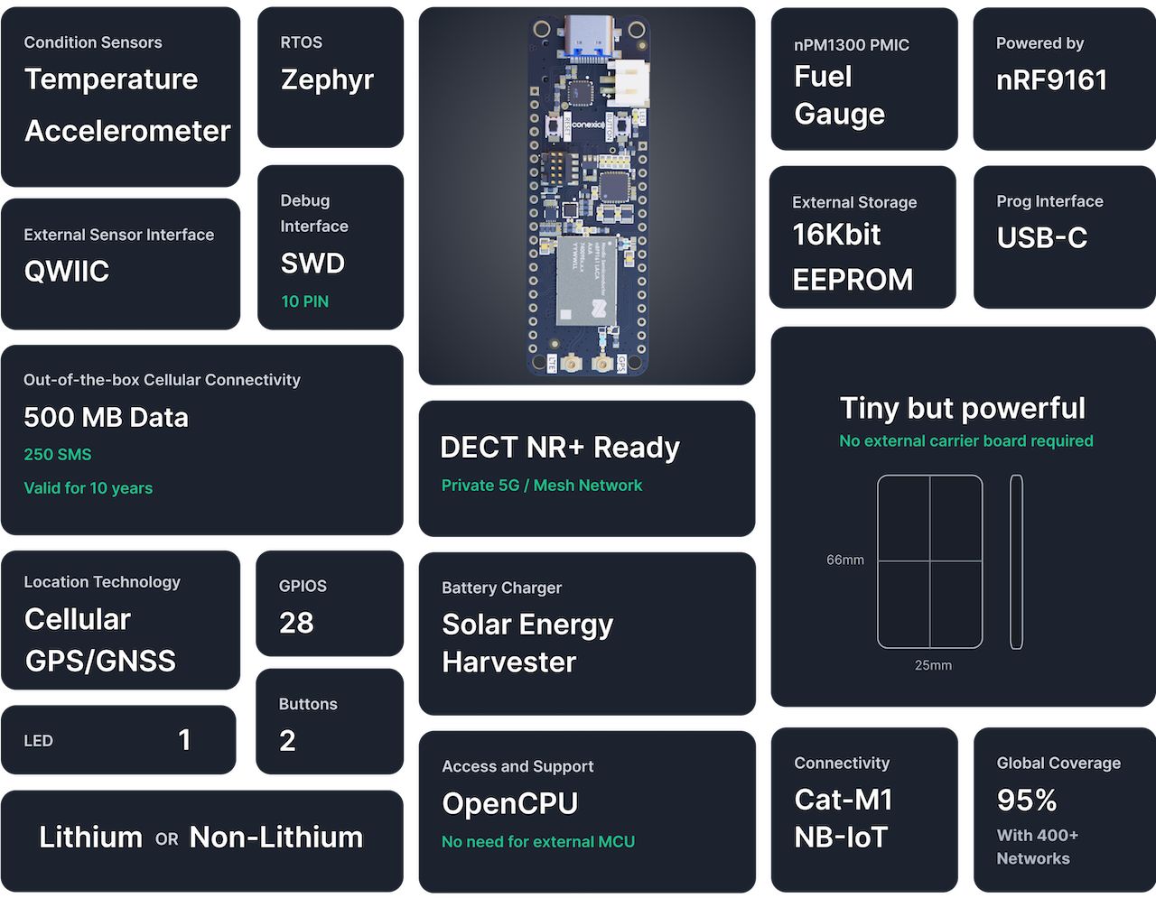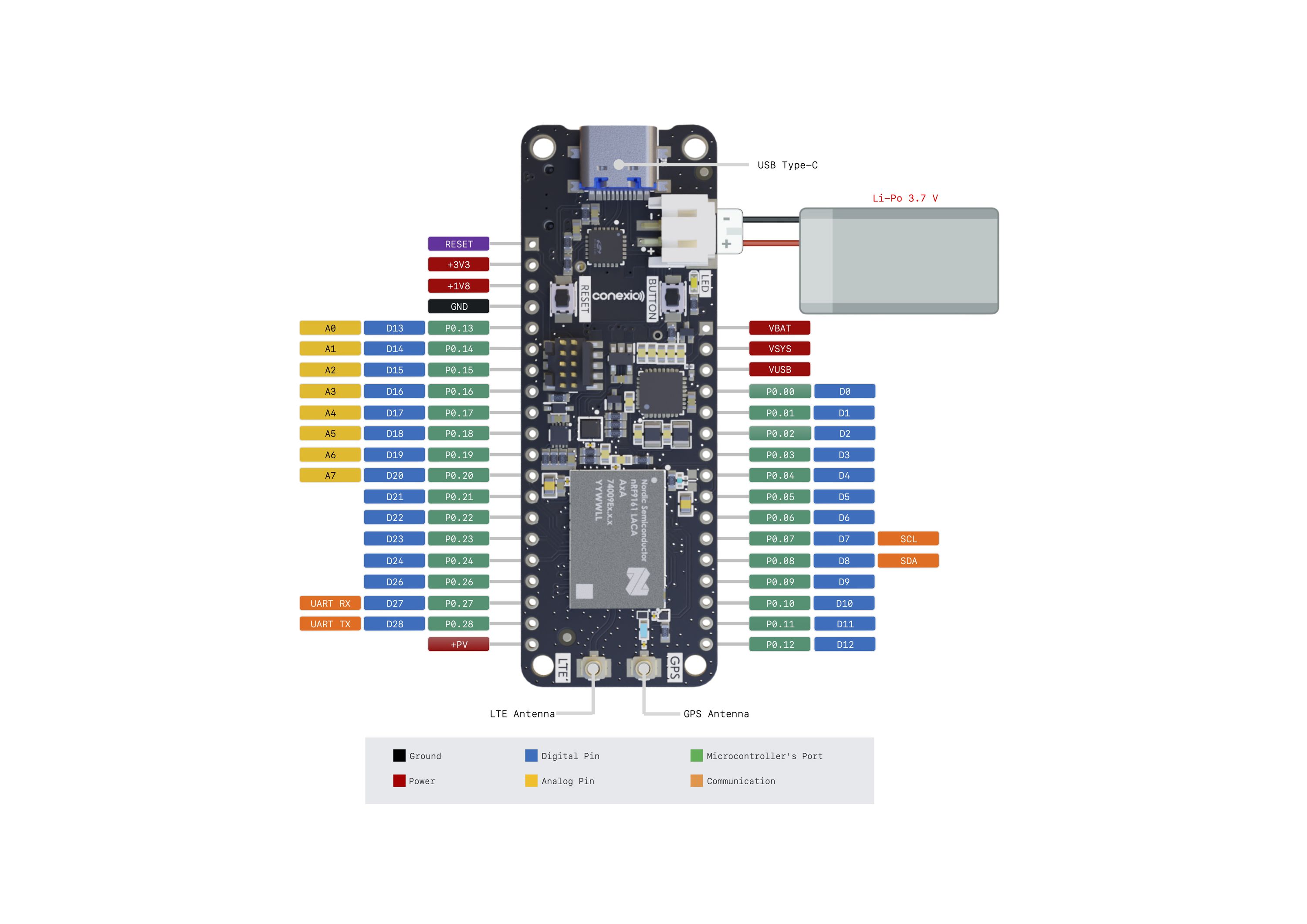 Conexio Stratus Pro is a tiny-yet-powerful development kit for creating cellular-connected electronic projects and products. Powered by the cutting-edge nRF9161 cellular modem from Nordic Semiconductor, Stratus Pro offers unparalleled versatility, reliability, and ease of use, making it the go-to solution for IoT developers worldwide. It is a battery-operated platform, making it ideal for prototyping cellular IoT systems, such as asset tracking, environmental monitoring, smart metering, and even industrial automation.