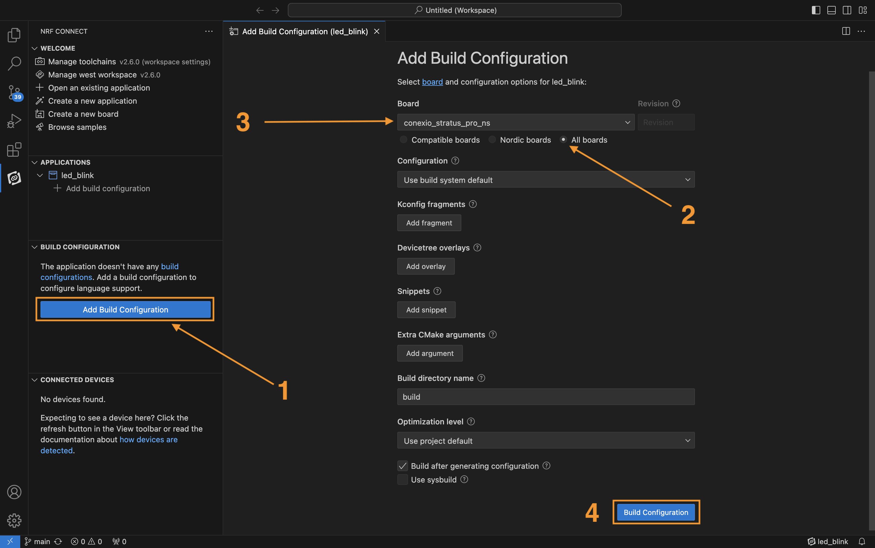 To make the application and project development with Conexio Stratus Pro fun and fast for low-level application designers and novices alike, we made Stratus compatible with nRF Connect for Visual Studio Code. Using the nRF Connect plugin, you can build, compile, and deploy code to the Stratus Pro with minimal effort. Create projects with nRF Connect SDK and Zephyr RTOS with built-in templates created by the Conexio team.