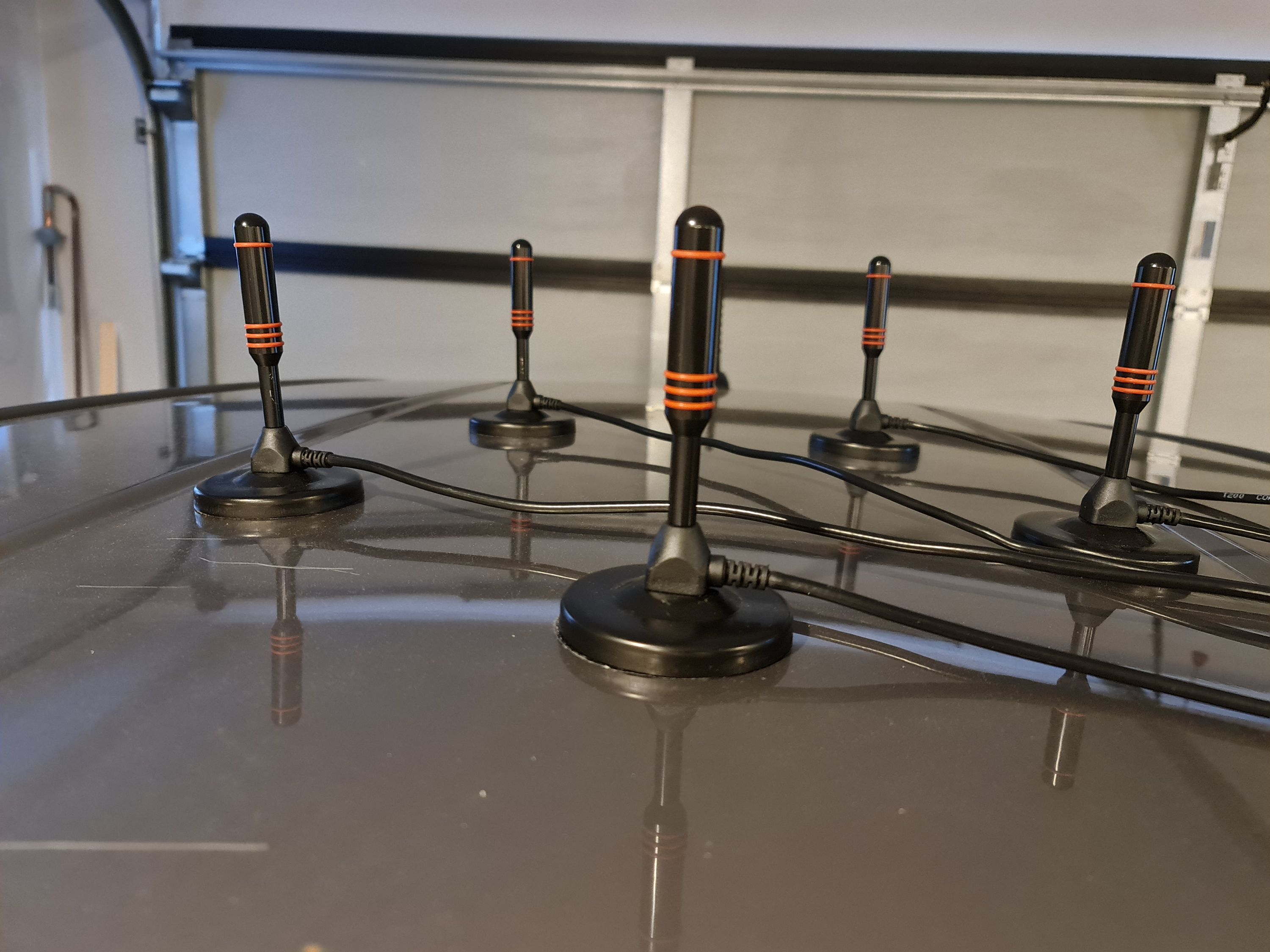 To work as a radio direction finder, KrakenSDR needs five antennas. In order to detect signals from 360 degrees, you will need a circular array of omnidirectional antennas such as whips or dipoles. So, to go along with the release of KrakenSDR, we are offering an optional set of five magnetic whip antennas that you can mount, for example, on the roof of your car. (Please note the magnetic whip antennas shown below may differ slightly from the ones we end up shipping, but they will be equivalent in value and performance.)