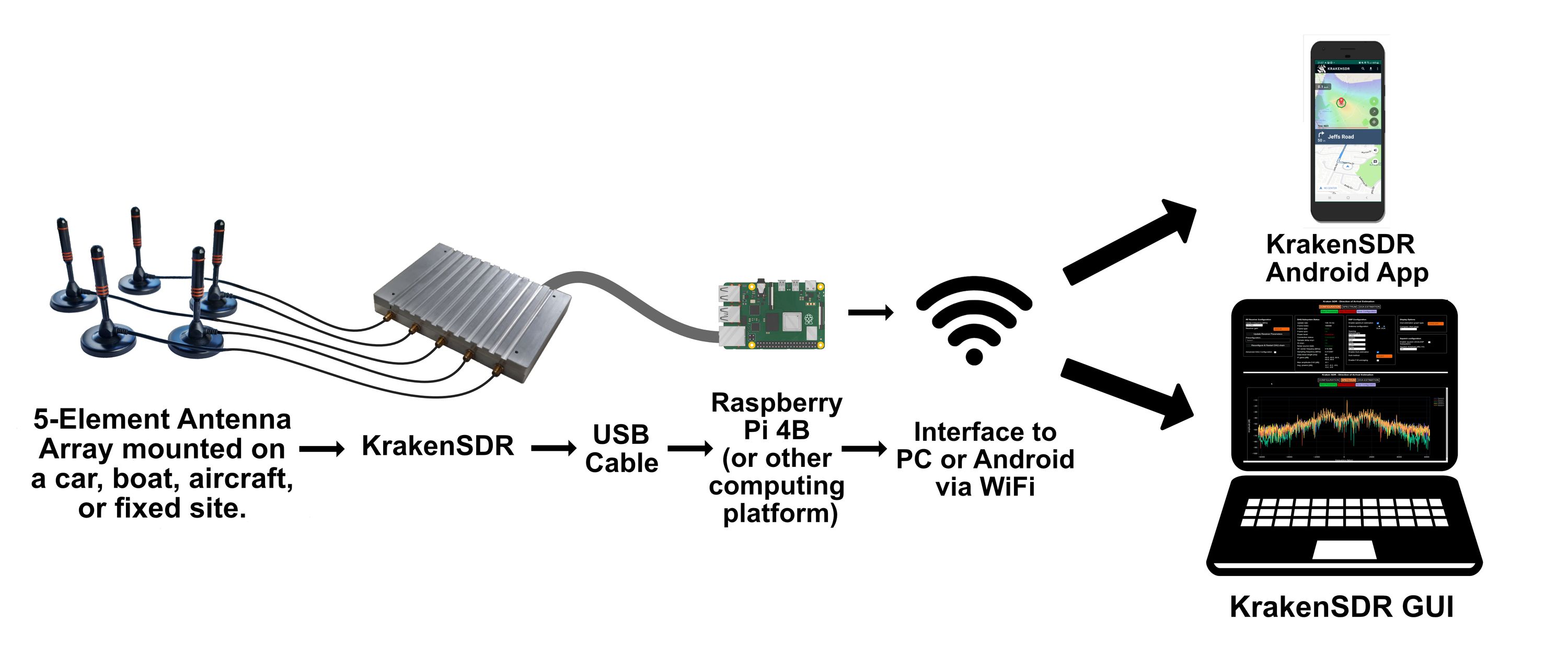 This fully assembled and tested KrakenSDR comes installed in a custom aluminum enclosure and includes a free copy of the KrakenSDR Android app.