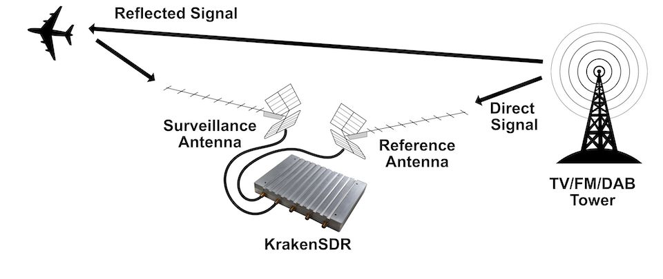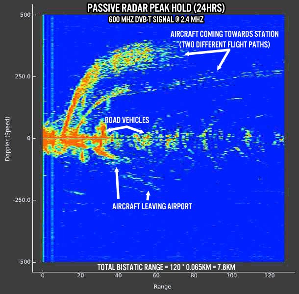 Passive Radar makes use of existing FM, TV, mobile phone, and other strong broadcast transmitters. The signal from these transmitters reflects off objects such as road vehicles, ships, and aircraft. By using two antennas on two receive channels and an algorithm to compare the reflected signal against a clean reference copy of the actual signal, we can achieve a radar-like display of bi-static range vs Doppler speed.