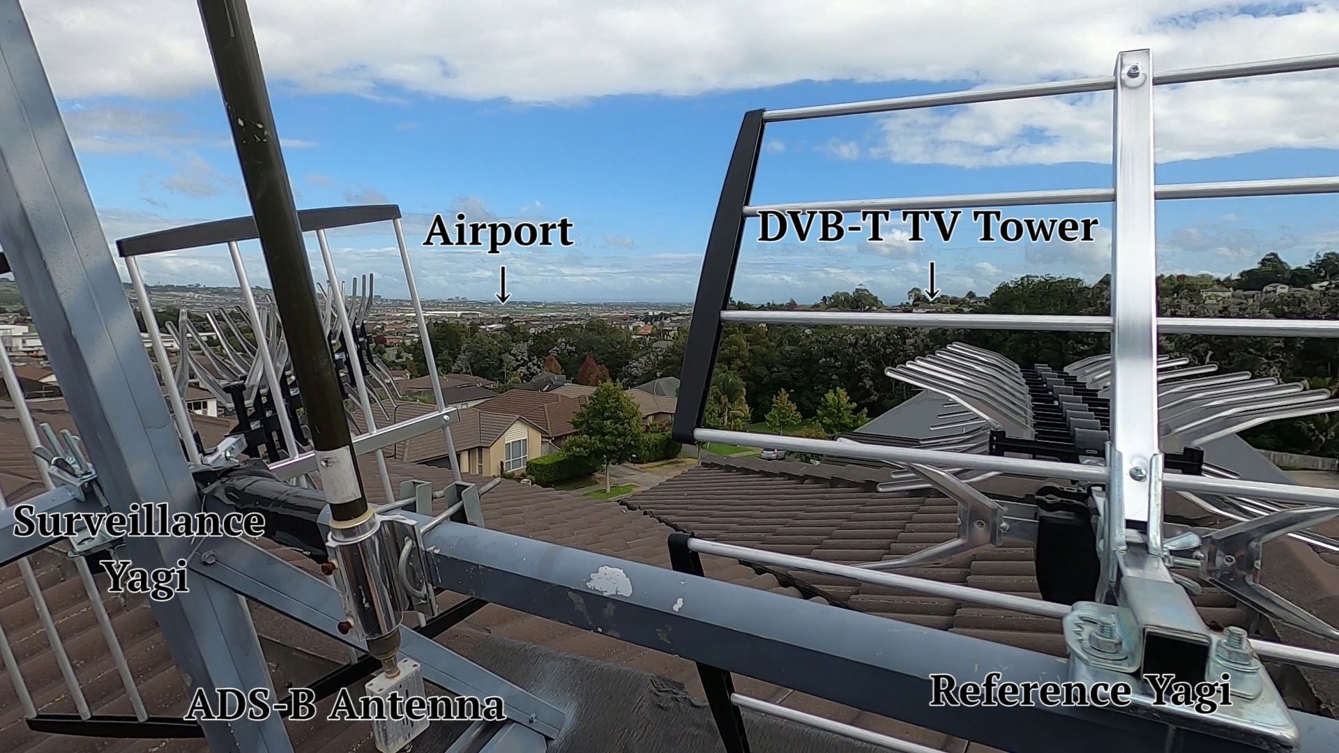 For passive radar you will need to determine the location of a useful broadcast tower in your vicinity and an appropriate direction toward your targets of interest. The geometry cannot be such that the broadcast tower and targets are in the same direction. The further apart they are in terms of angles, the better. Then you point one directional Yagi antenna toward the broadcast tower and the other toward the targets of interest. The diagram, photograph, and plot below illustrate this configuration: