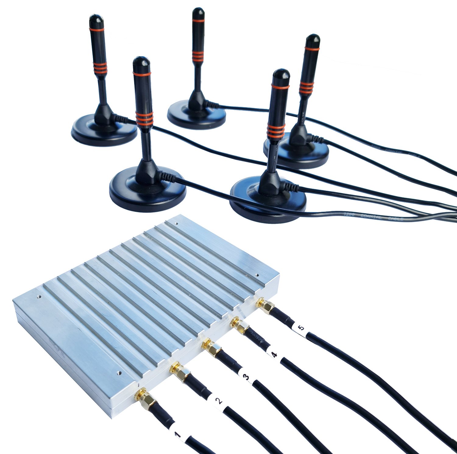 A set of five magnetic, telescopic whip antennas—with 100 MHz to 1 GHz tuning range—that can be used with KrakenSDR for direction finding. The magnets are strong and will be secure on the roof of a moving car. Includes a set of five three-meter, LMR100-equivalent coax cables that have been length matched for better performance.