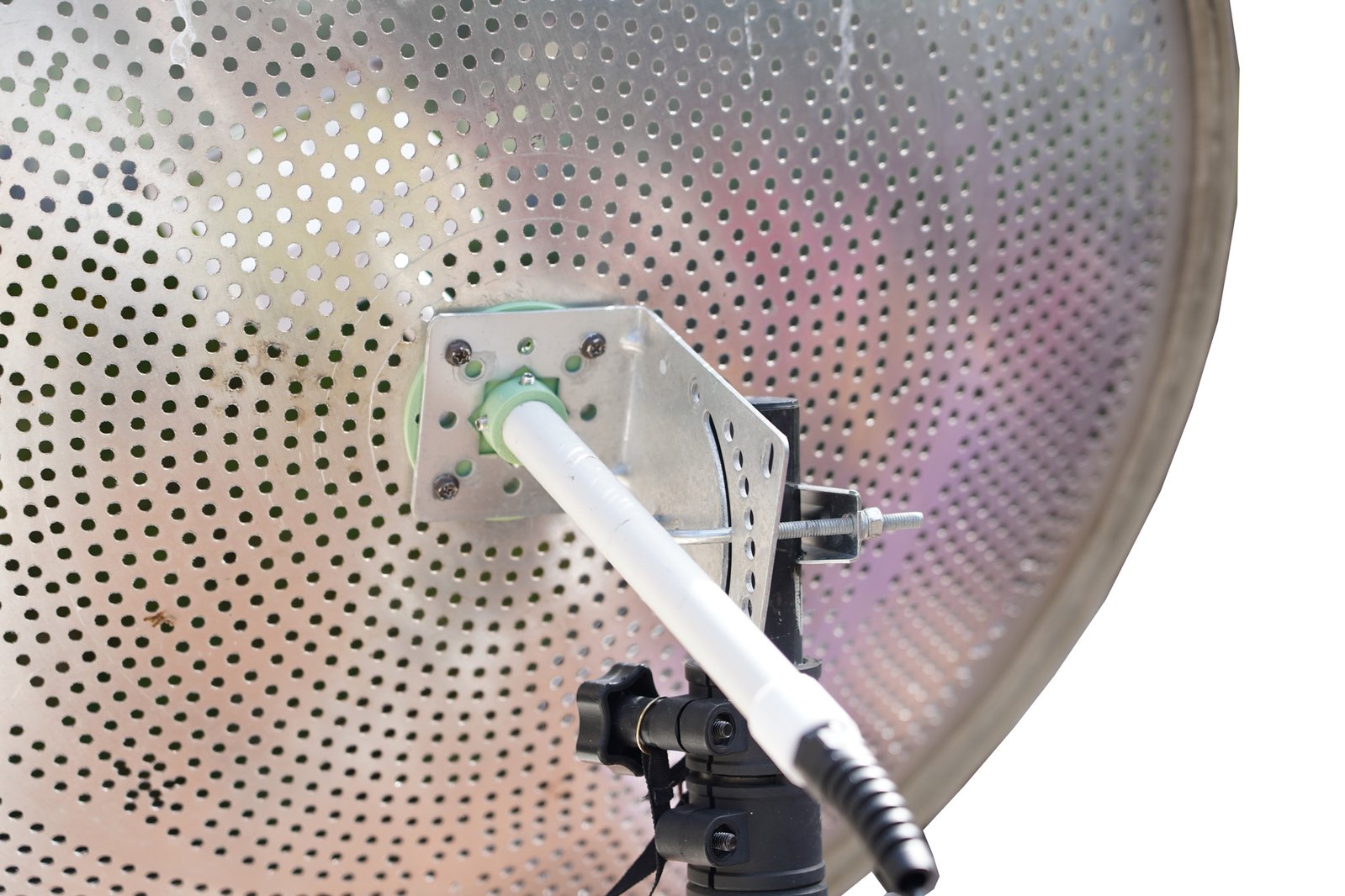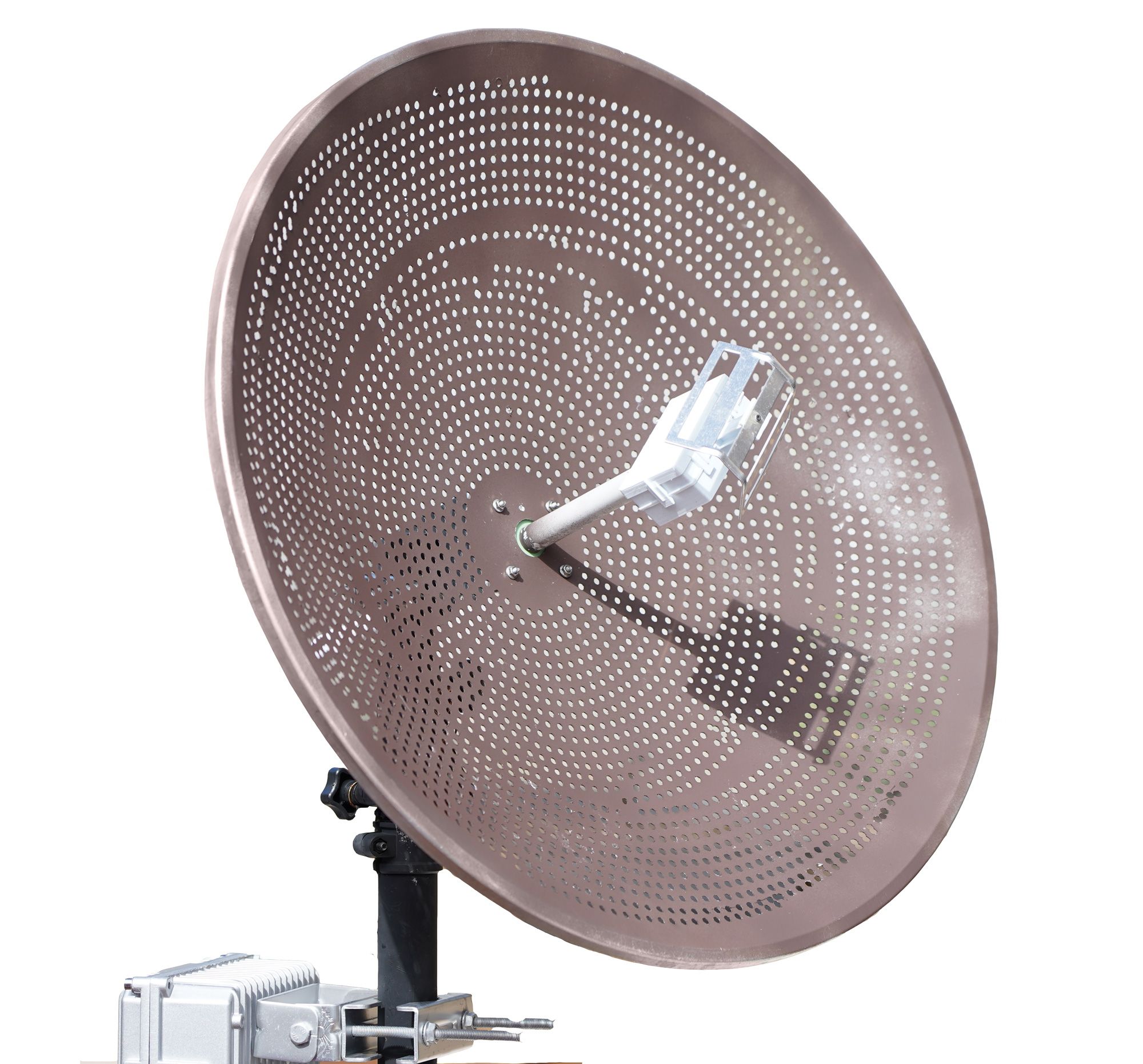A lightweight, 70 cm diameter parabolic reflector with pole/mast mounting bracket and feed guide. The reflector comprises three aluminum petals that require assembly with a screwdriver. This is the dish and mount only - make sure you combine it with a feed!