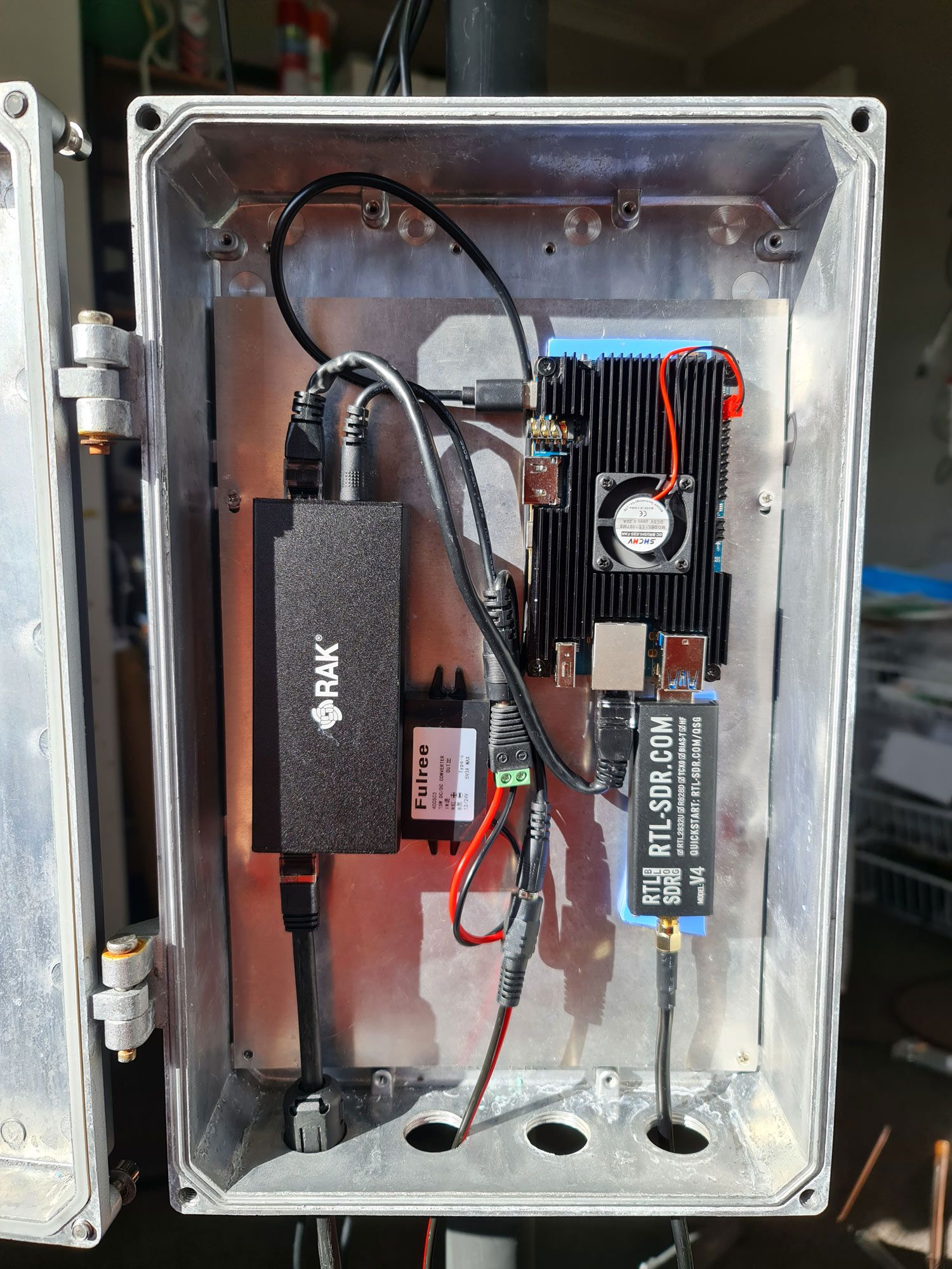 In our tests, we have been running an RTL-SDR Blog V4, Orange Pi 5, and Power over Ethernet (PoE) splitter in the enclosure, and running the SatDump GUI directly on the Orange Pi 5. This results in a neat contained system where only one Ethernet cable needs to be run to the enclosure from inside a building.