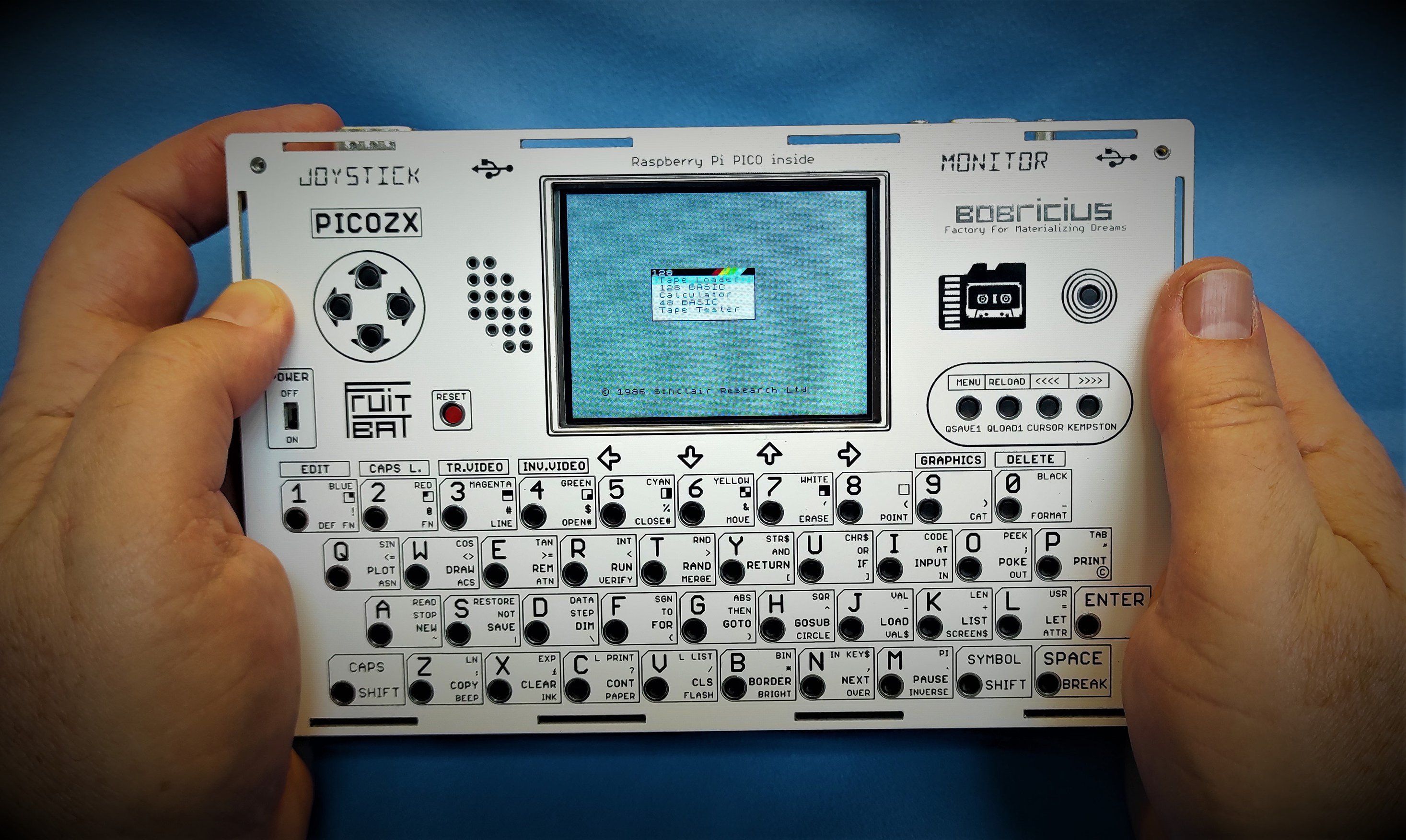 A single-PCB recreation of the original Sinclair ZX Spectrum computer, fully assembled and tested, with a built-in speaker, LCD, and full-color touch keyboard