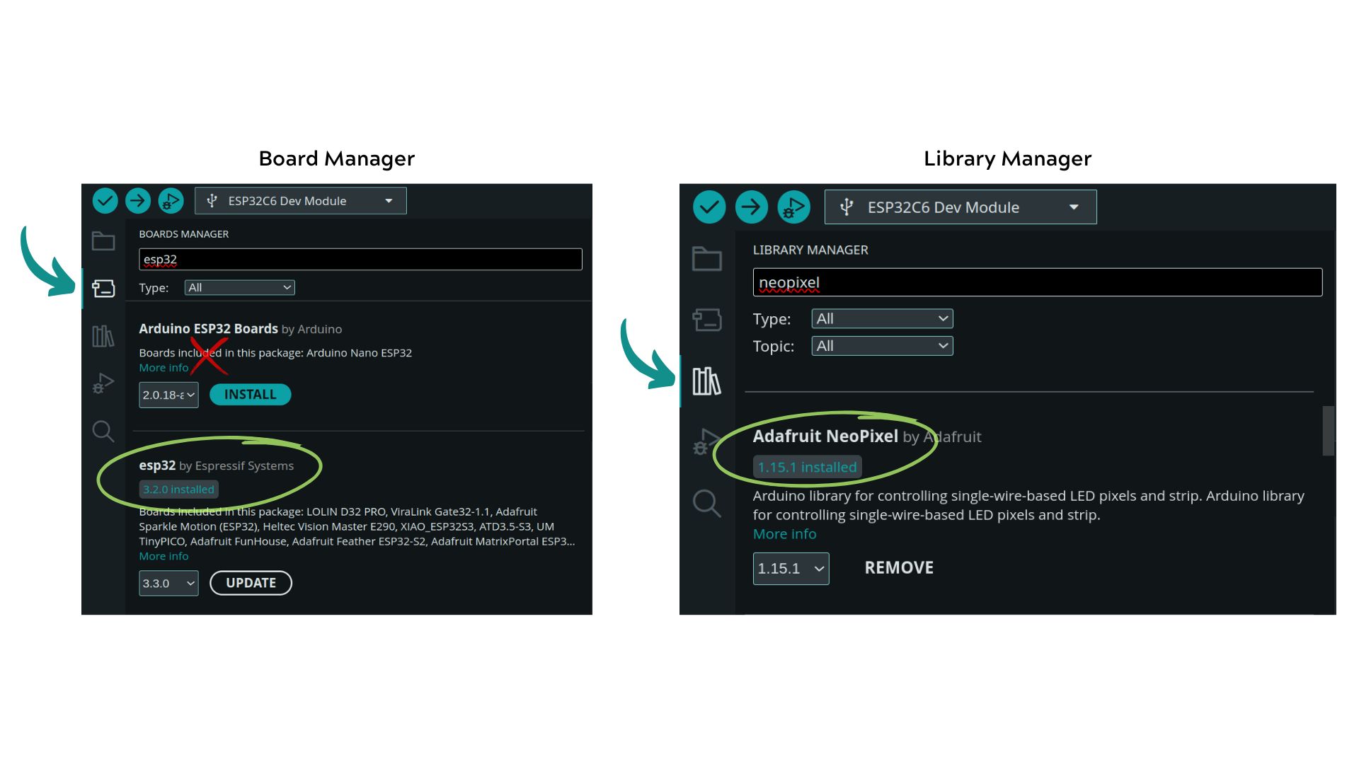 Search for "ESP32" and install "ESP32 by Espressif Systems" (do not install the Arduino ESP32 boards).