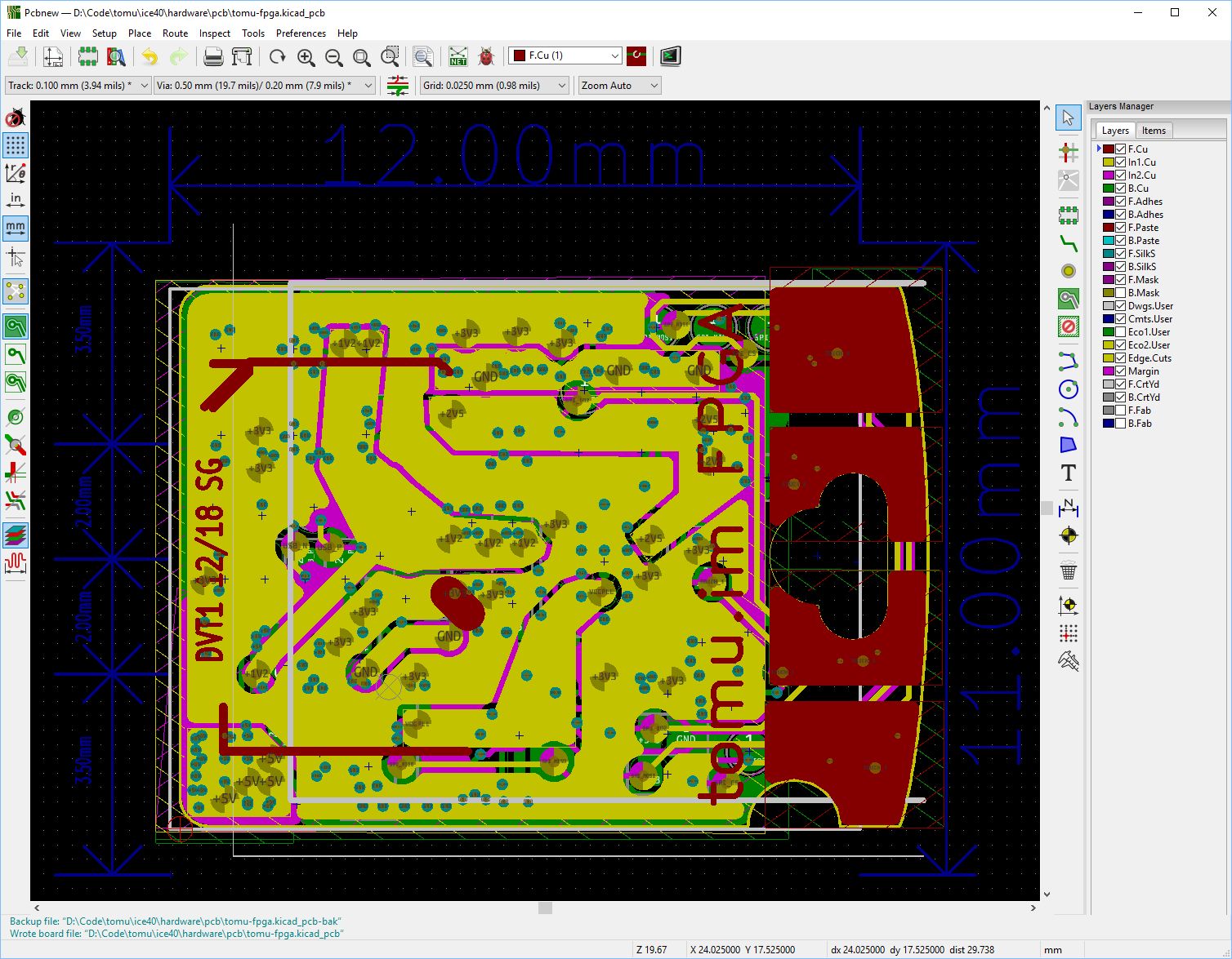 With the lessons learned from the EVT board, we have created a smaller DVT board. This includes most of the components from the EVT version, but shrinks it down to the size of a USB port. The DVT version must use a more complicated four-layer, blind-buried process, which allows for via connections between inner layers. We have also moved to the smaller ICE40 WLCSP component. Despite these mechanical changes, the schematic hasn’t changed much (e.g., components such as the Raspberry Pi header have been removed).