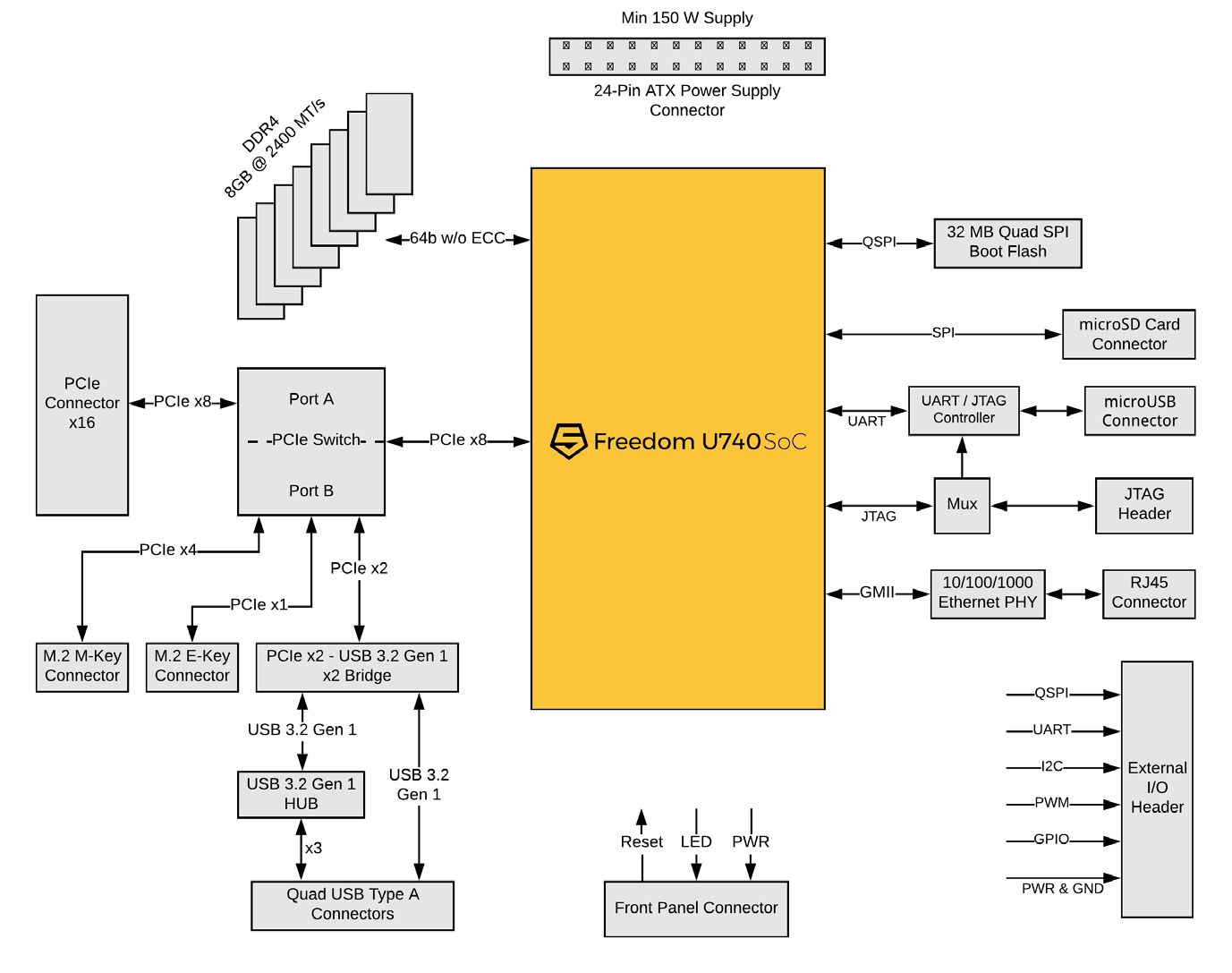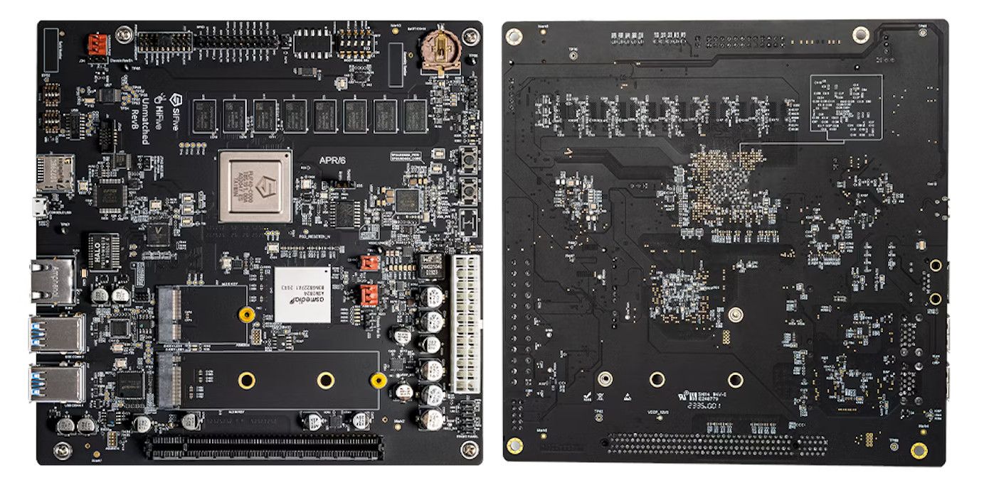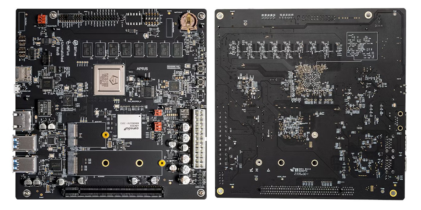 The HiFive Unmatched from SiFive ushers in a new era of RISC-V Linux development platform in a PC form factor. Powered by the SiFive Freedom U740 RISC-V SoC and targeted for creating RISC-V applications, the platform features 16 GB of 64-bit DDR4 memory operating at 2400 MT/s, high-speed interconnects with PCIe Gen 3 x8 operating at 7.8 GB/s, Gigabit Ethernet, and USB 3.2 Gen 1. Software development is supported with Freedom U-SDK from SiFive, which provides a fast and convenient software environment to quickly build and modify a custom Linux distribution for this RISC-V PC.