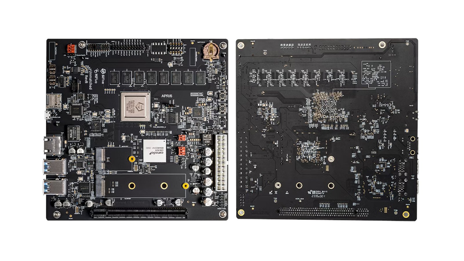 The latest revision of the SiFive's Mini-ITX board with 16 GB of onboard DDR4 RAM and SiFive Freedom U740 SoC. This version runs exactly the same firmware and software as the original, and has additional features to accommodate operation in cluster environments (automatic start on power and restart if shutdown).