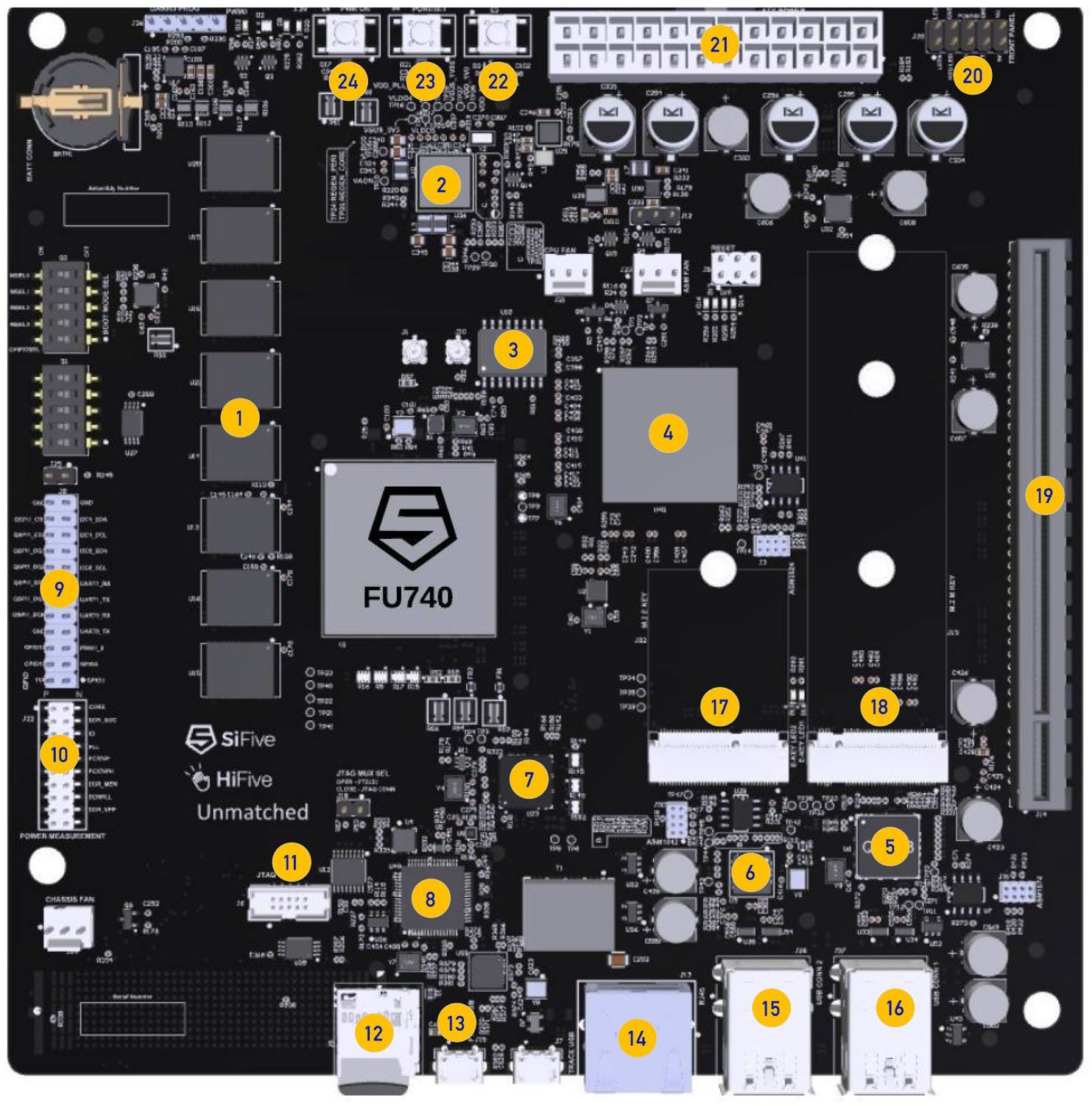 | 6. PCIe-USB bridge | 14. RJ45 connector | 22. FU740 reset |