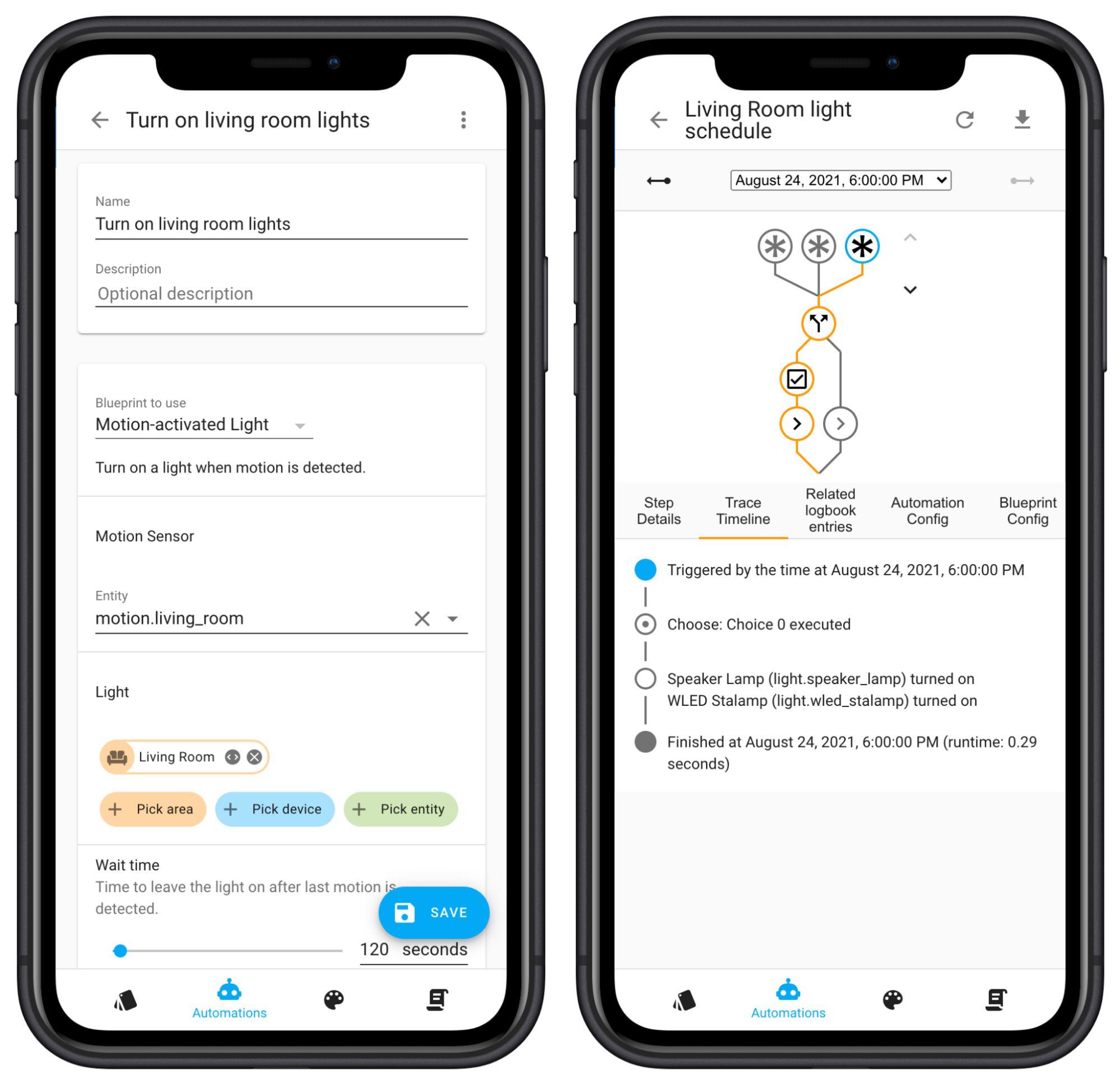 Use our advanced automation editor to create powerful automations, or select one of the many automation blueprints contributed by Home Assistant’s global community of users. Blueprints are templates that you can easily configure, like picking a motion sensor and an area to create a motion-based automation.