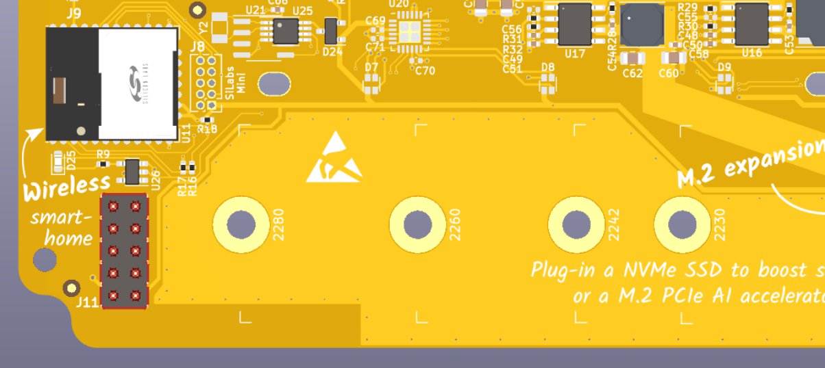 The Raspberry Pi Compute Module 4 allows you to communicate with external components via GPIO pins. Most GPIO pins on Home Assistant Yellow are used for on-board features such as the Zigbee module, audio DAC and for the debug console. This is why we don’t include a Raspberry Pi-compatible 40-pin header - most of those pins are already used. Instead, there is a 10-pin header (labeled J11 in the image below) that exposes a serial port and I²C. This header is compatible with the first ten pins of the standard 40-pin header, which makes it compatible with accessories that only use those first ten pins.