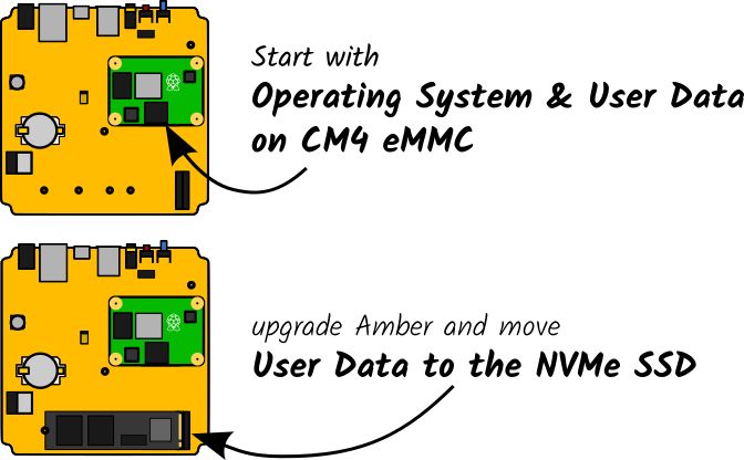 The flagship Home Assistant Yellow product comes pre-installed with a variant of the Raspberry Pi Compute Module 4 (CM4) that has 16 GB of eMMC flash storage, where the operating system and all user data (e.g., sensor readings) are stored. As you install more third-party applications or collect more sensor data, you may want to expand Yellow’s storage capacity. You can do this by upgrading the CM4 to a variant with 32 GB of eMMC flash storage, or by installing an NVMe solid-state drive (SSD) in Yellow’s M.2 slot.
