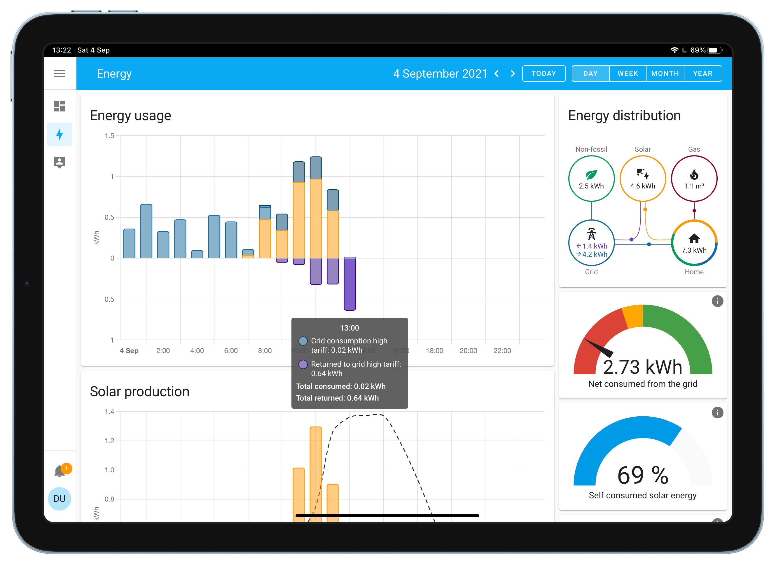 Home Assistant Yellow helps you track your energy. By pairing Home Assistant Yellow with supported sensing hardware, you can see both how much energy you’re using at the moment and trends over time. Solar panels, home batteries, and gas usage are also supported.
