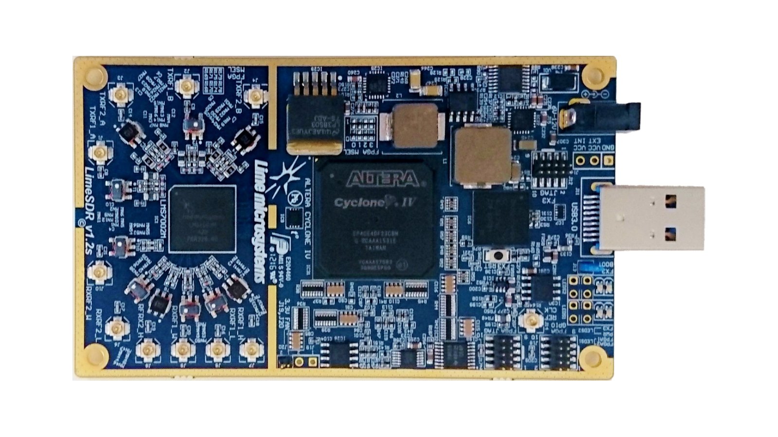 The LimeSDR is based on Lime Microsystem’s latest generation of field programmable RF transceiver technology, combined with FPGA and microcontroller chipsets. These connect to a computer via USB 3 with a Type-A connector. LimeSDR then delivers the wireless data and the CPU provides the computing power required to process the incoming signals, and to generate the data to be transmitted by the LimeSDR to all other devices.