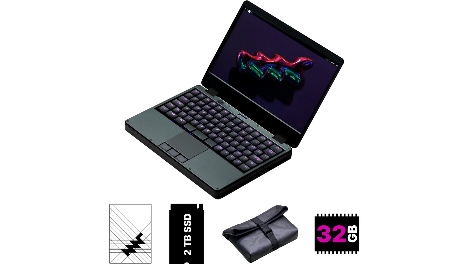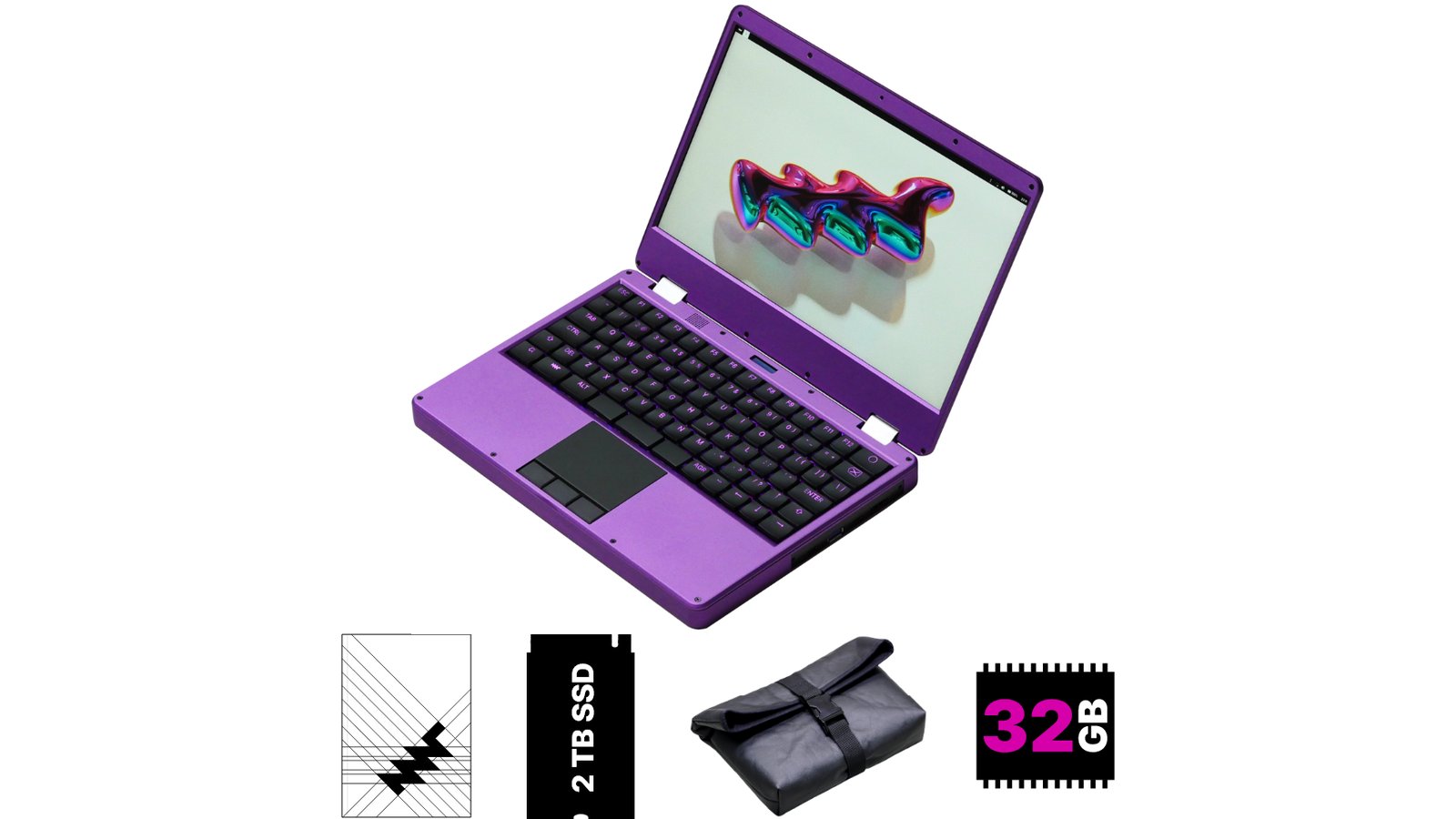 MNT Hyper Reform Next Laptop in Purple with 32 GB RAM, 2 TB NVMe SSD, Black Piñatex Sleeve, and Printed Handbook. AC Adapter not included.