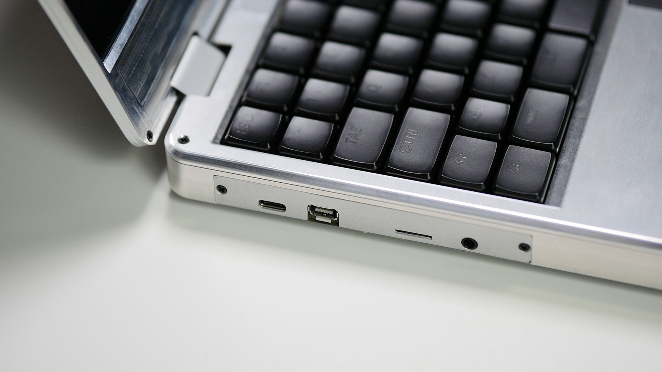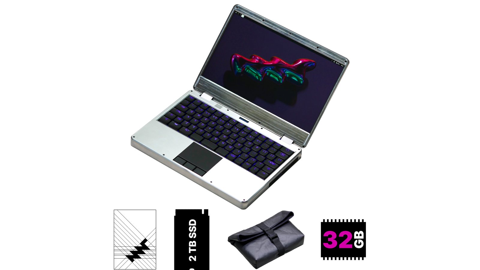 MNT Hyper Reform Next Laptop in Raw Aluminum with 32 GB RAM, 2 TB NVMe SSD, Black Piñatex Sleeve, and Printed Handbook. AC Adapter not included.