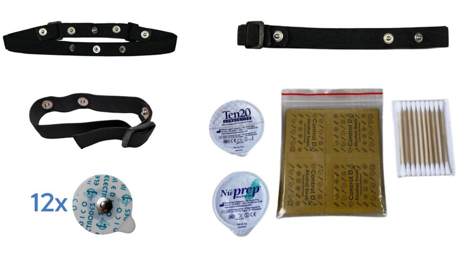 Accessory bundle with dry electrode bands and skin preparation kit for recording the best quality data. Comes with 1 muscle BioAmp band, 1 heart BioAmp band, 1 brain BioAmp band, 9 grams of NuPrep skin prep gel, 15 grams of Ten20 conductive paste, 12 baby gel electrodes, 100 alcohol swabs, 100 cotton swabs