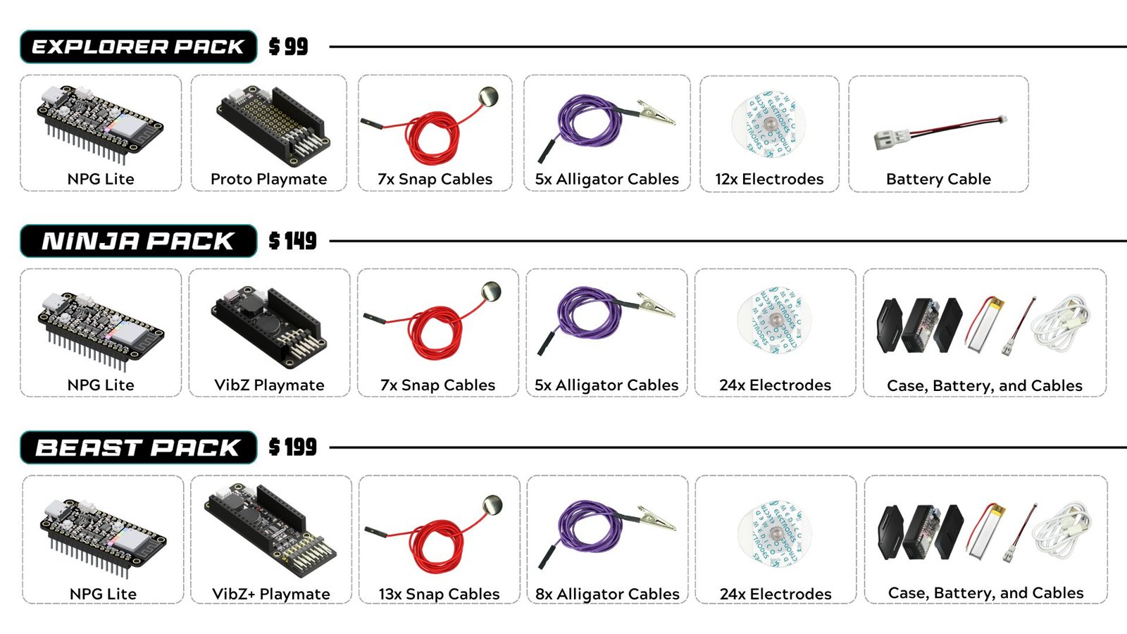 For those who want a pre-assembled system in a 3D printed case with battery, haptic & auditory feedback: 1 NPG Lite board, 1 VibZ Playmate, 7 snap cables, 5 alligator cables, 24 gel electrodes, 1 LiPo battery, 1 Type-C cable, and 1 3D printed case