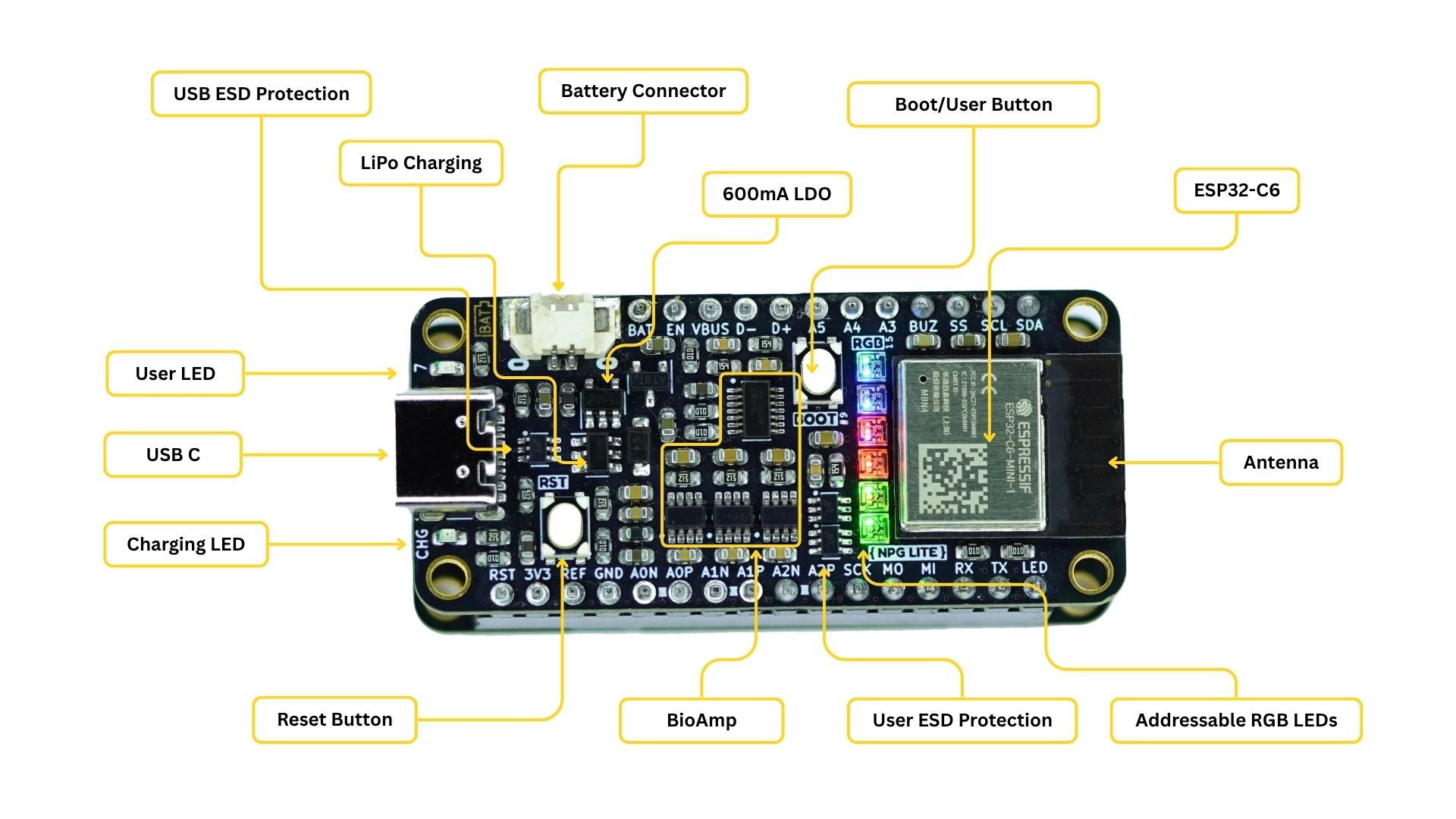 Neuro PlayGround Lite (NPG Lite) is a multichannel Feather-form-factor wireless bio-physiological signal acquisition board. It can be used for Electrocardiography (ECG), Electromyography (EMG), Electrooculography (EOG), or Electroencephalography (EEG). Its compact footprint and hassle-free setup ensure portability, quick deployment, and a clutter-free experience, making it ideal for research, education, and wearable applications.