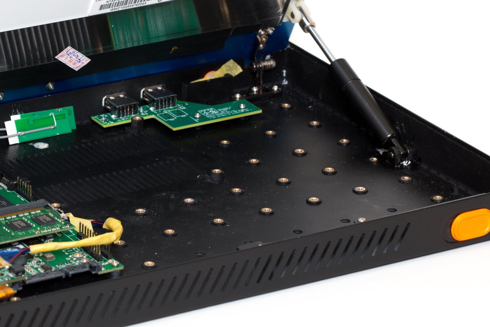 In the design shown here, you can access the internals without having to remove a single screw – in fact, the laptop opens itself for you. With the slide of a latch, the screen automatically pops open thanks to an internal gas spring. As the internals are naked when the screen is up, this is not a computer for casual home use. Another side benefit of this design is there’s no fan noise – when the screen is up, the motherboard is exposed to open air and a passive heatsink is all you need to keep the CPU cool.