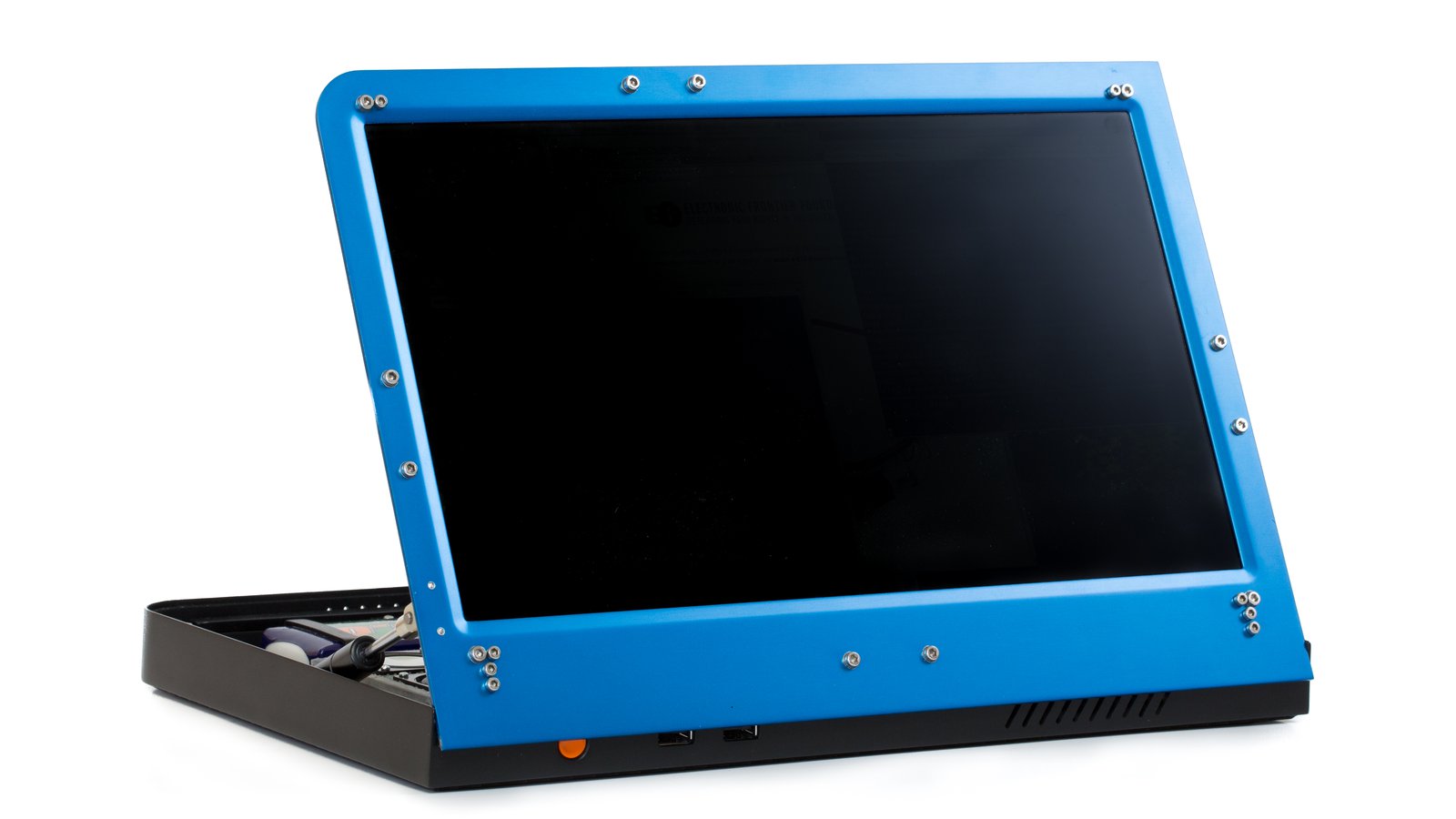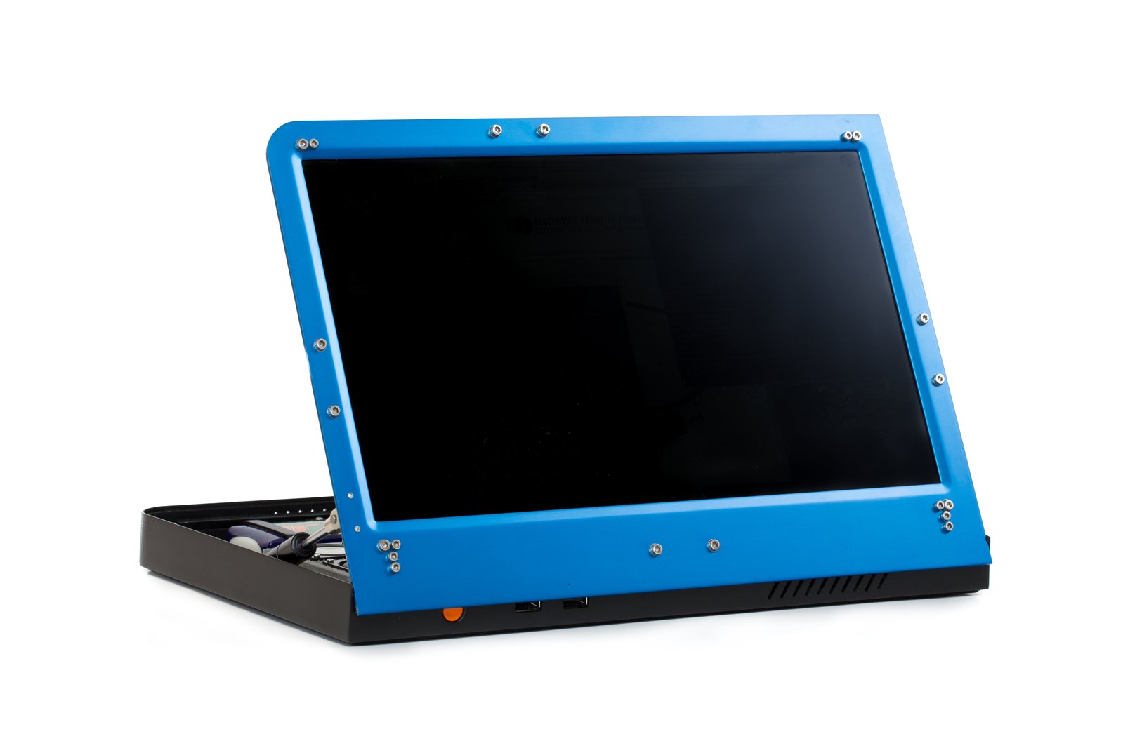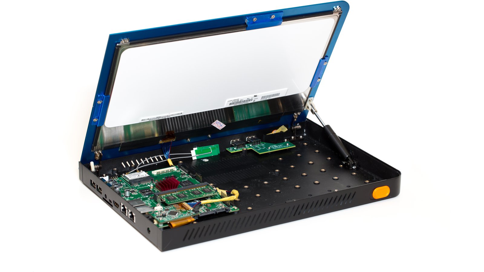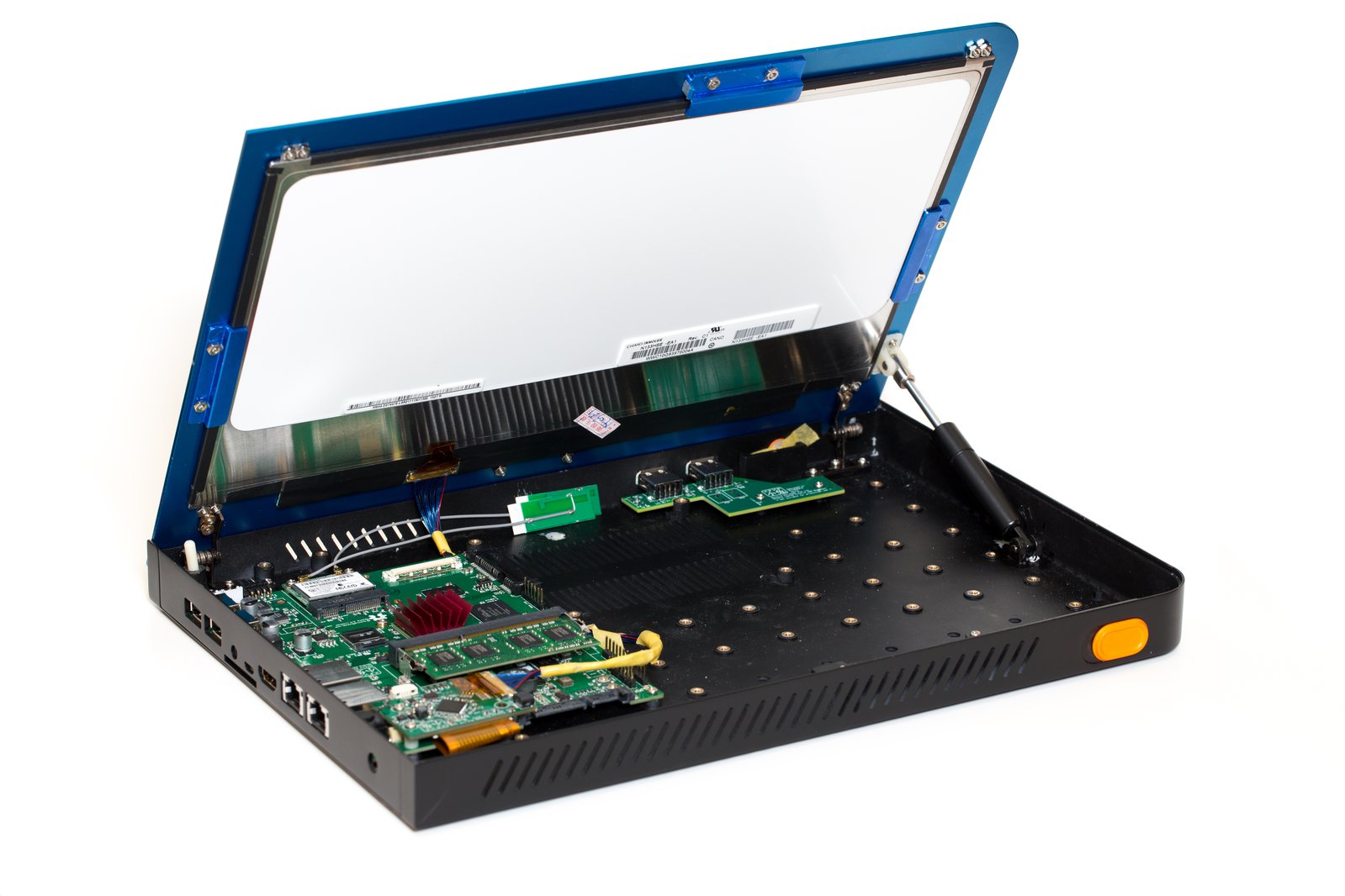 Plug in your favorite keyboard and mouse, and you're ready to go; perfect for labs and workbenches. You get the circuit board above, inside a hacker-friendly case with a Full HD (1920x1080) IPS LCD, plus an extra aluminum bezel to hack on.