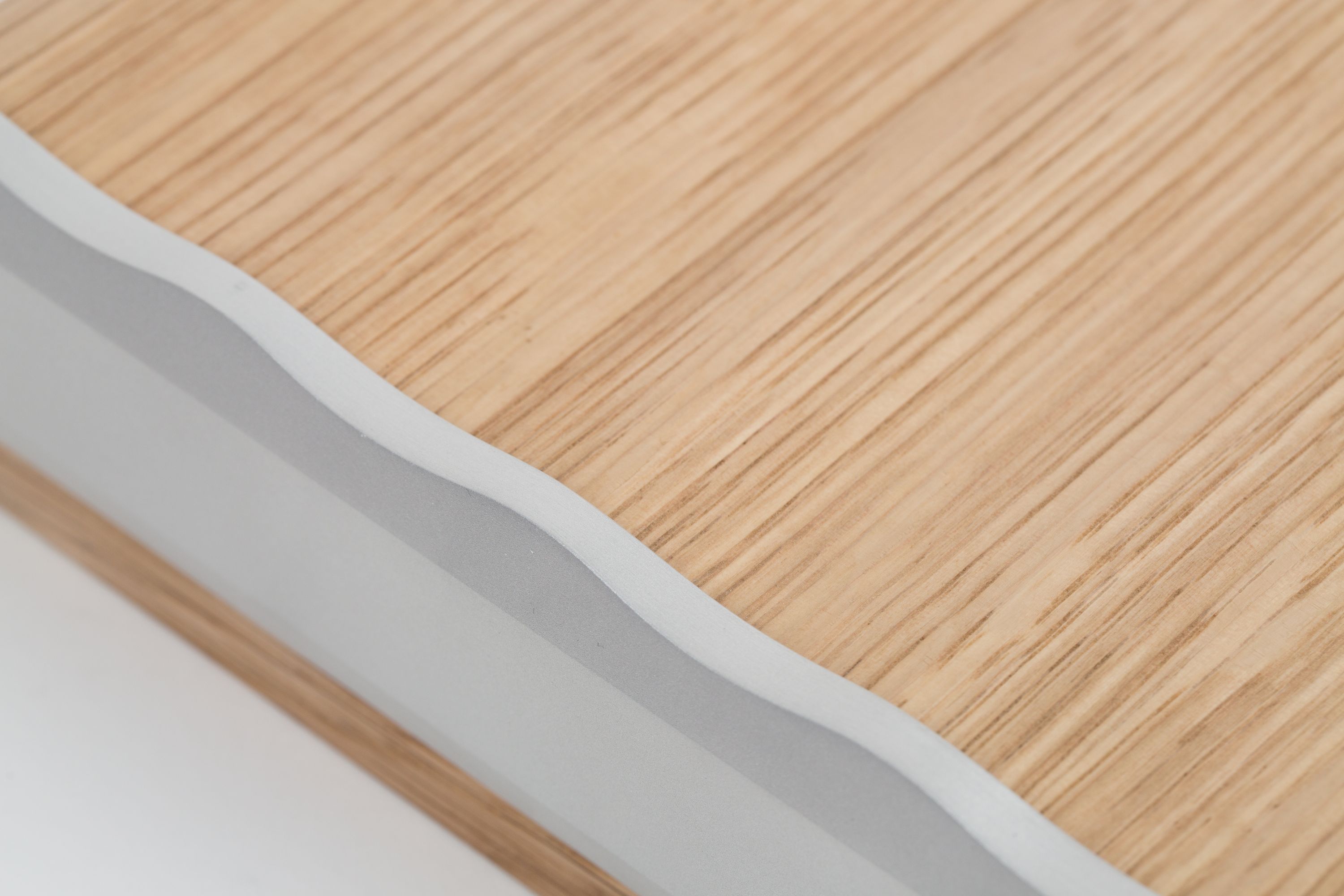 For the prototype case, Kurt is featuring rift-sawn white oak and bead-blasted-and-anodized 6061 aluminum. He developed a composite consisting of outer layers of paper backed wood veneer over a high-density cork core with intervening layers of 5.5 ounce fiberglass cloth, all bonded with a high modulus epoxy resin. This composite is then gracefully formed into semi-monocoque curves, giving a final wavy shape that is both light, stiff, and considers the need for air cooling.