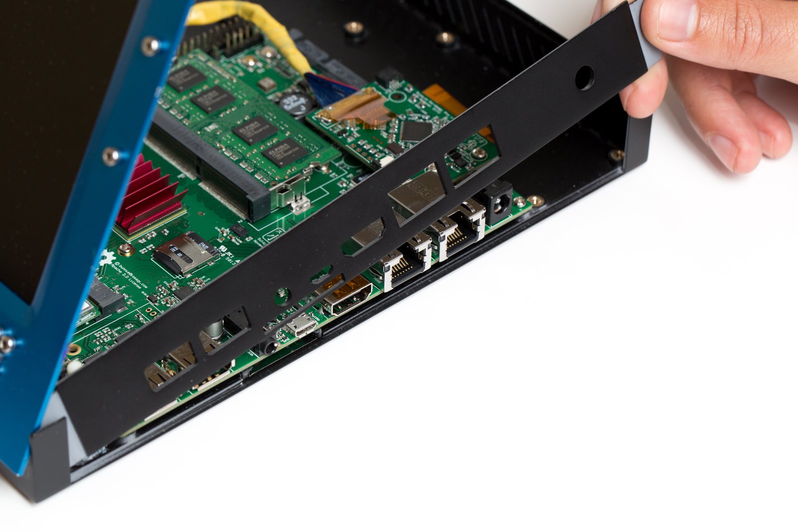 Most components are pre-assembled in the case, including the internal accessory connectors, the motherboard, and eDP adapter board. User assembly required for LCD bezel selection, and for speaker box.