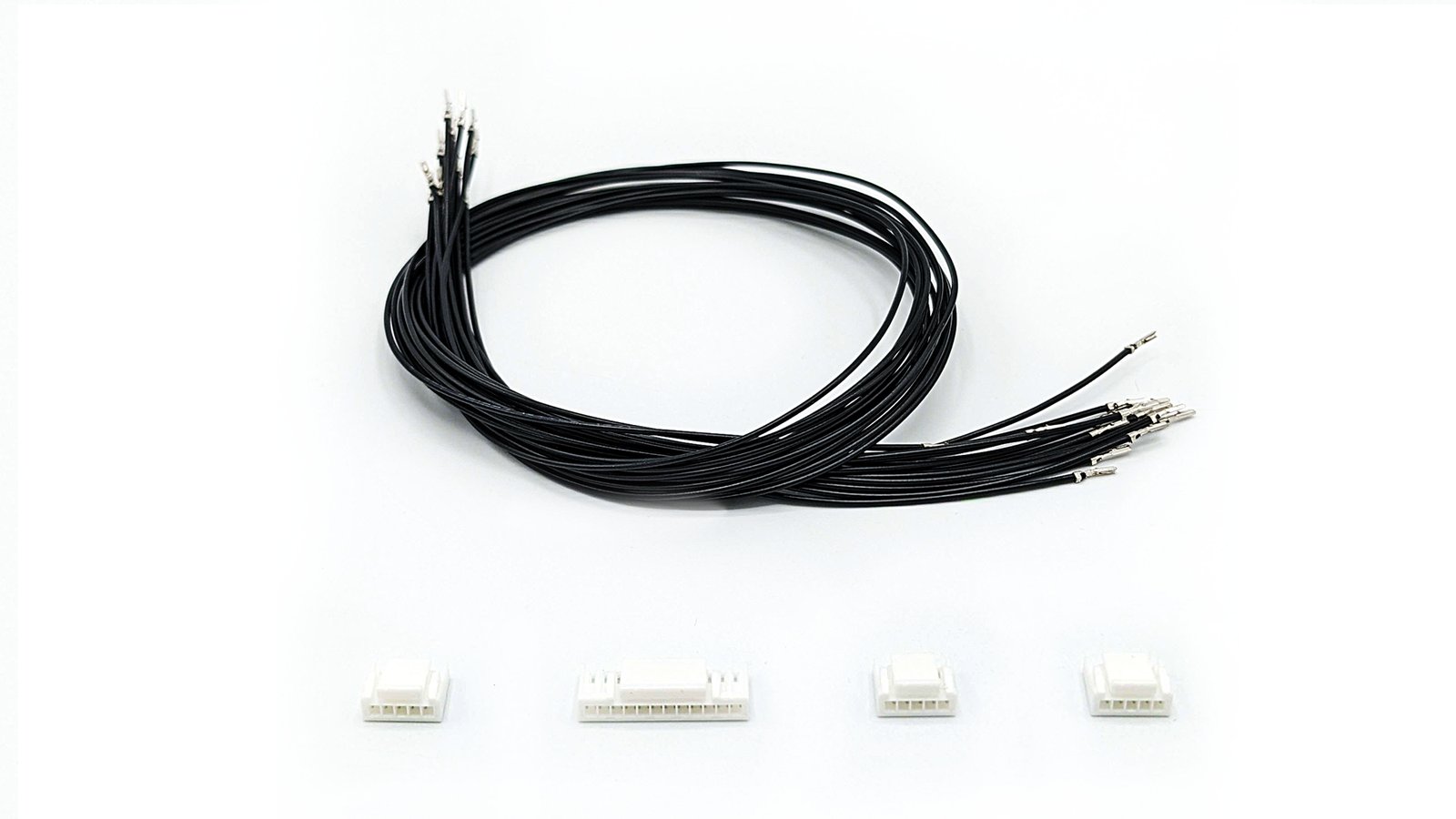 Wire harness kit with 2x 4-pos JST-GH housing, 1x 5-pos housing, 1x 12-pos housing, and 14x 300 mm pre-crimped 28AWG wire
