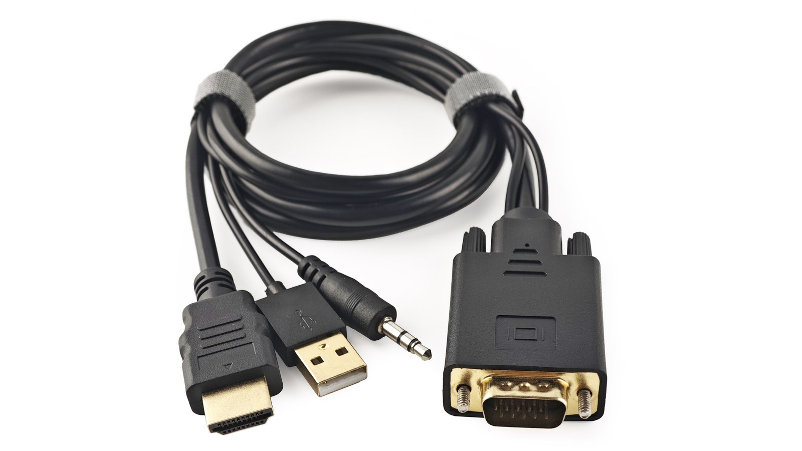 This cable converts VGA video and audio to HDMI, supporting up to 1080p HD resolution. It features a VGA male port for video input, a 3.5mm audio input, a USB male port for power supply, and an HDMI male port for video output.