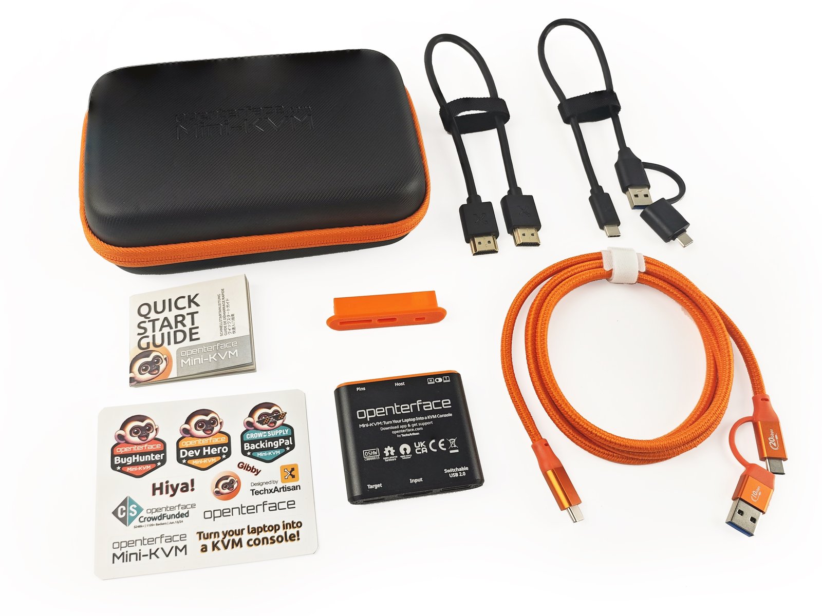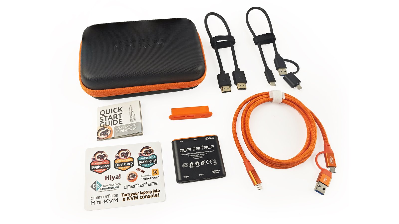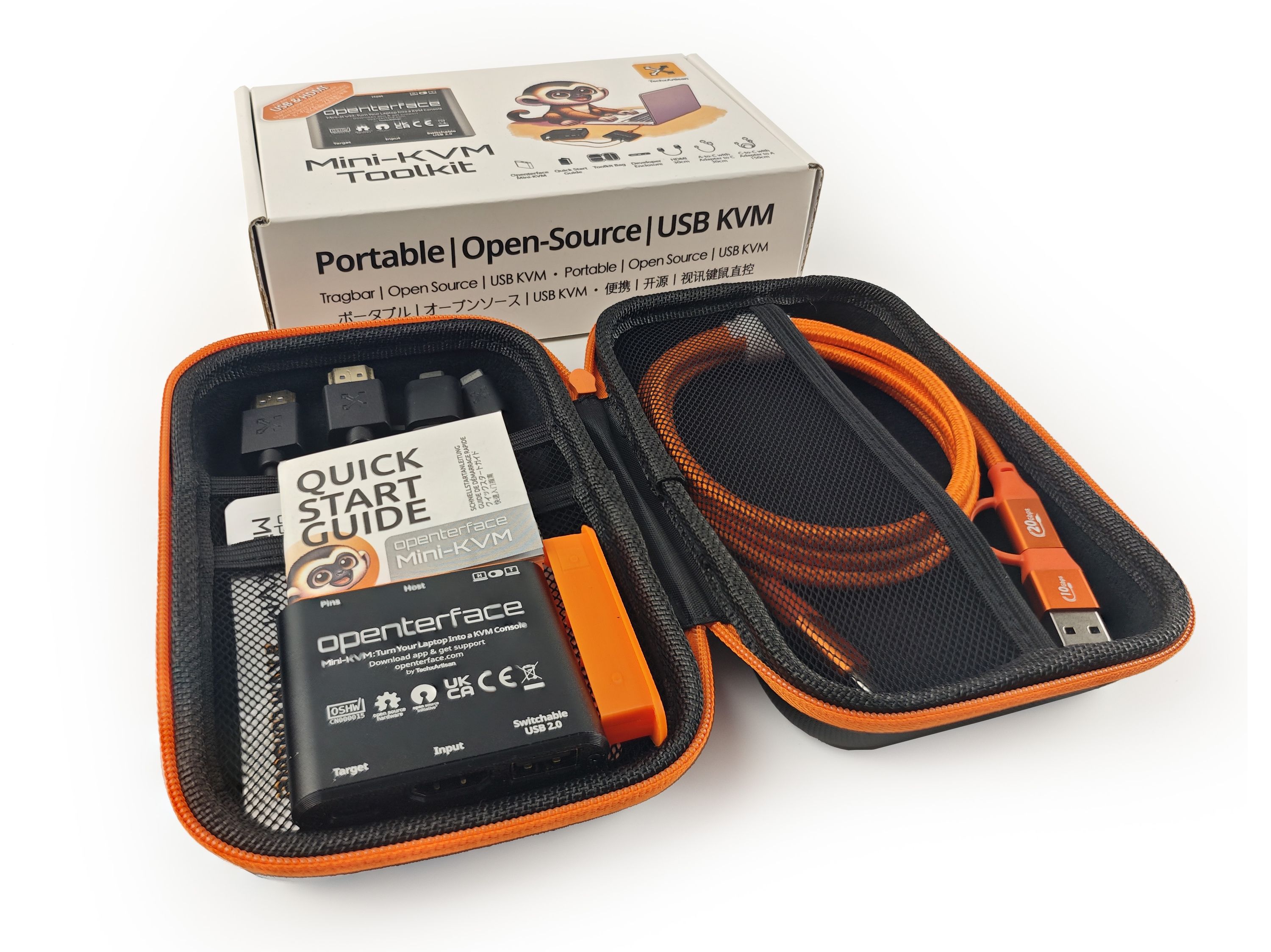 Openterface Mini-KVM with quick start guide, HDMI male-to-male cable (30 cm), type-C male to USB-A male cable (30 cm) with USB-A female to type-C male adapter, type-C male-to-male cable (150 cm), in a handy toolkit bag