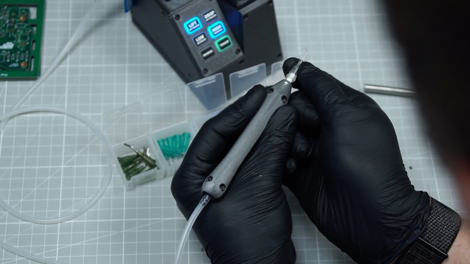 Pixel Pump ships with a set of five stainless-steel nozzles in each of five different sizes, with outer diameters ranging from 0.3 mm all the way up to 1.8 mm. With this set, you should be able to pick and place most SMD components, including small 0402 passives, larger parts like inductors and ICs, and just about everything in between. The nozzles are held in place by a Luer lock slip fitting that facilitates quick nozzle changes and broad compatibility with third-party nozzles. The pen itself features a barbed connection for the air hose and incorporates four M8 steel nuts to give it some heft and to enable magnetic attachment to Pixel Pump.