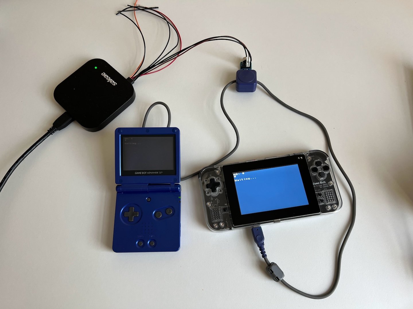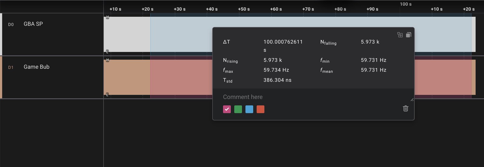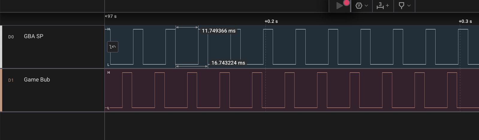 So, let’s take a look at how the Game Bub’s emulated GBA clock speed compares to a real GBA. We connected both the Game Boy Advance and the Game Bub to a logic analyzer via their link port. By generating pulses at a constant rate (from the GBA’s perspective), we can measure how fast each device is running. Using a special link cable breakout board that plugs into the center of the GBA link cable, we can easily test both devices at the same time.