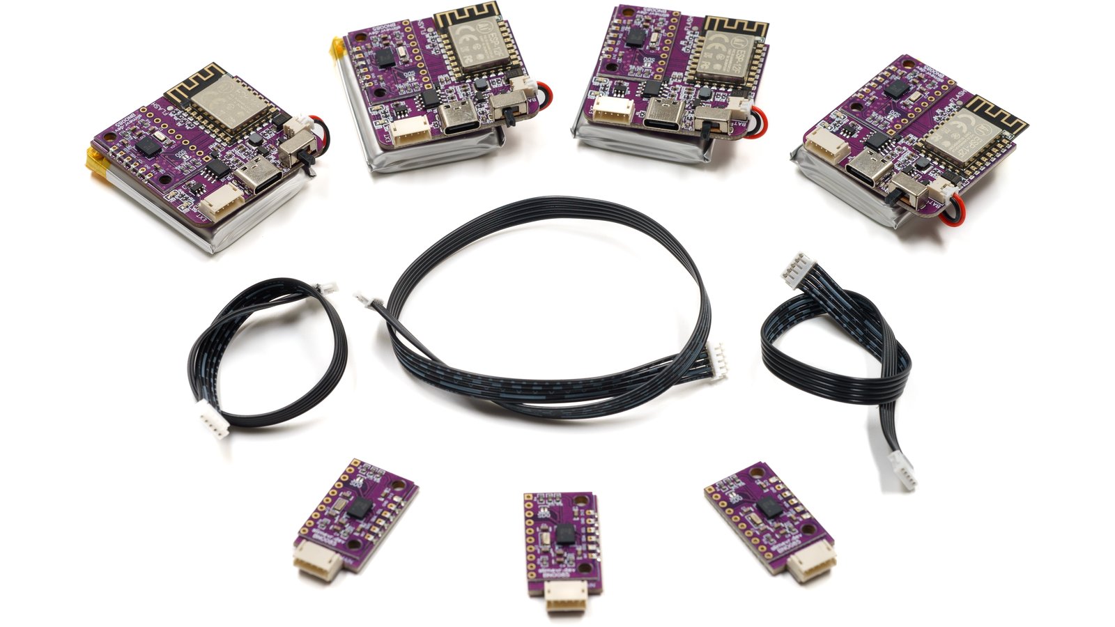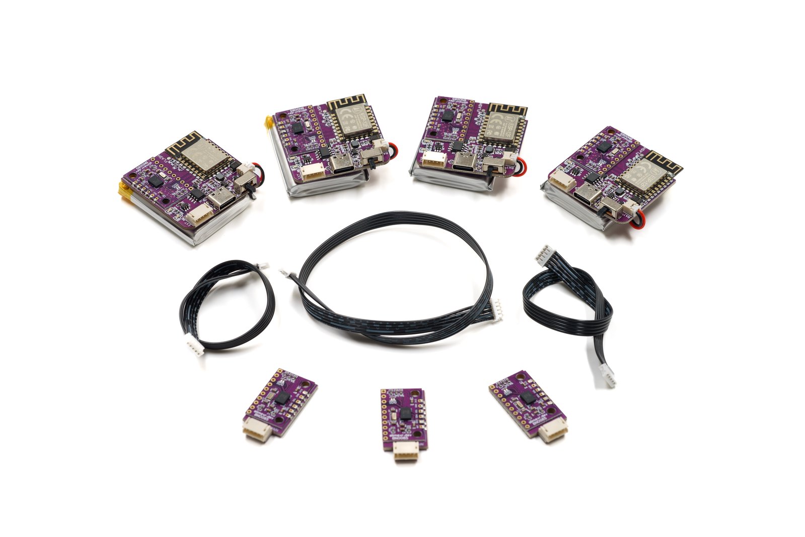Eight DIY SlimeVR tracker boards and two tracker extension boards, enough to track the position and rotation of your waist (with better precision than the Lower-Body Set), your knees, your chest, your feet, and your elbows. This DIY kit includes only the boards and connecting cables for the tracker extension boards. It does not come with enclosures, straps, batteries, or other accessories.