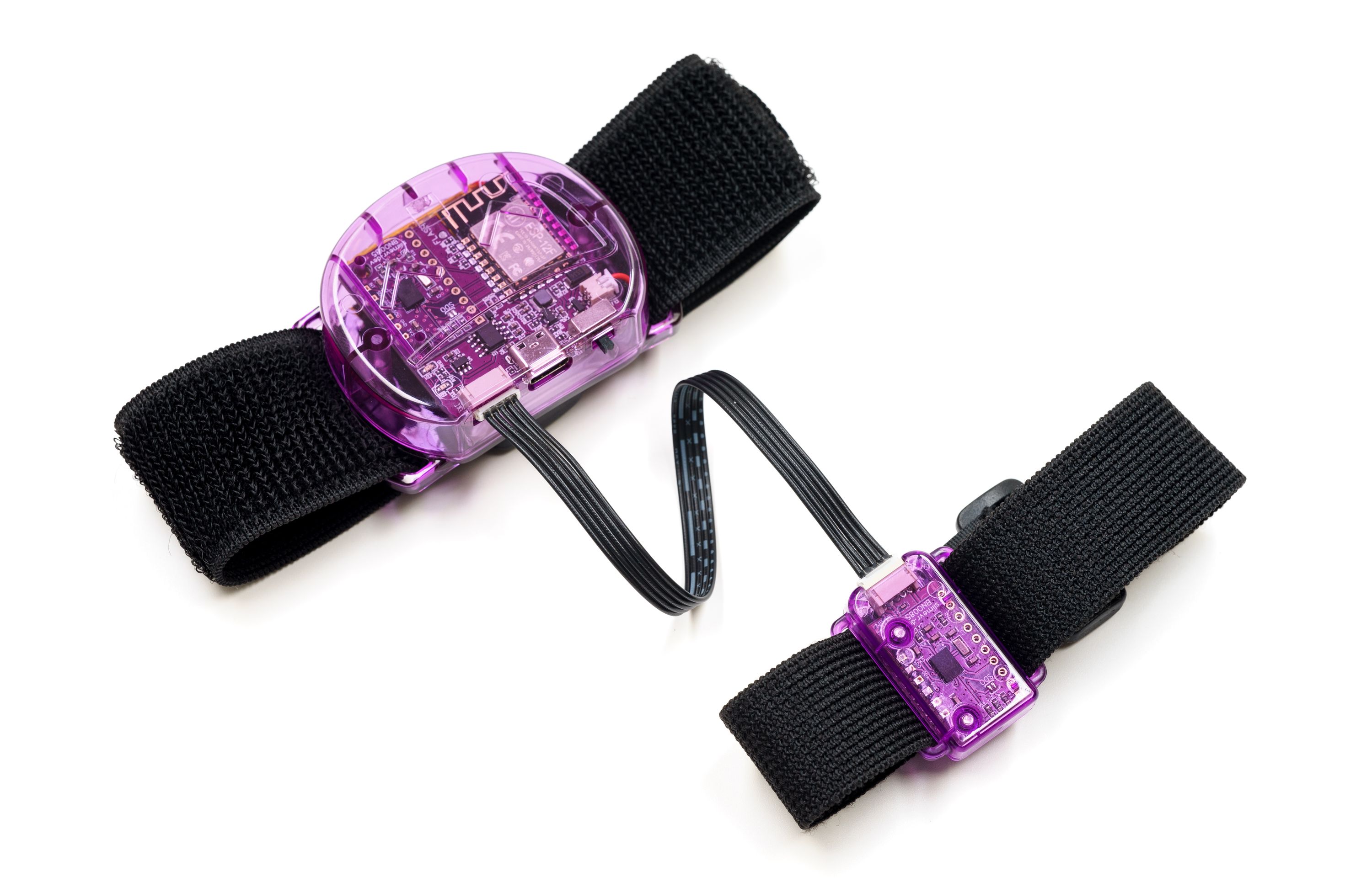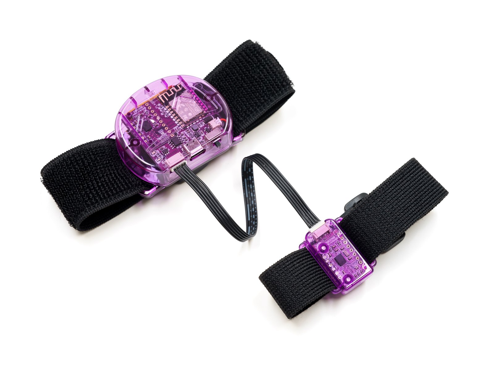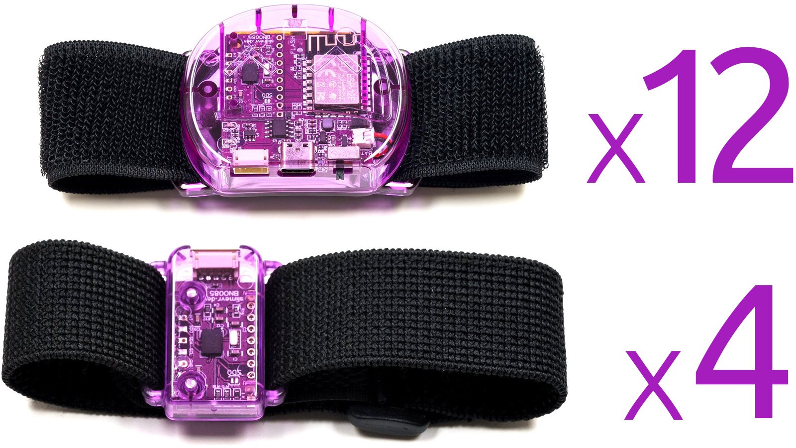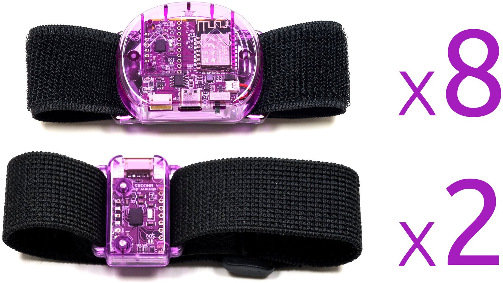 Twelve SlimeVR trackers and four tracker extensions (translucent purple), enough to track the position and rotation of your waist (with better precision than the Lower-Body Set), your knees, your chest, your feet, and your elbows, with enough left over (with extra straps) to experiment with motion capture and other innovations. Includes two tracker extension cables, four torso straps (38 mm x 1000 mm), four thigh straps (38 mm x 500 mm), eight ankle/elbow straps (38 mm x 350 mm), four foot straps (25 mm x 300 mm), two narrow torso straps (25 mm x 1000 mm), two USB Type-C cable, two sets of stickers, and an instruction manual.