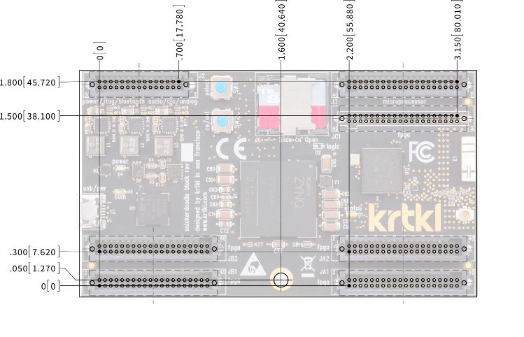 Full snickerdoodle pinout (270 pins) on 0.1” headers, JTAG connector, DC power jack. Note: order your snickerdoodle connectors "down".