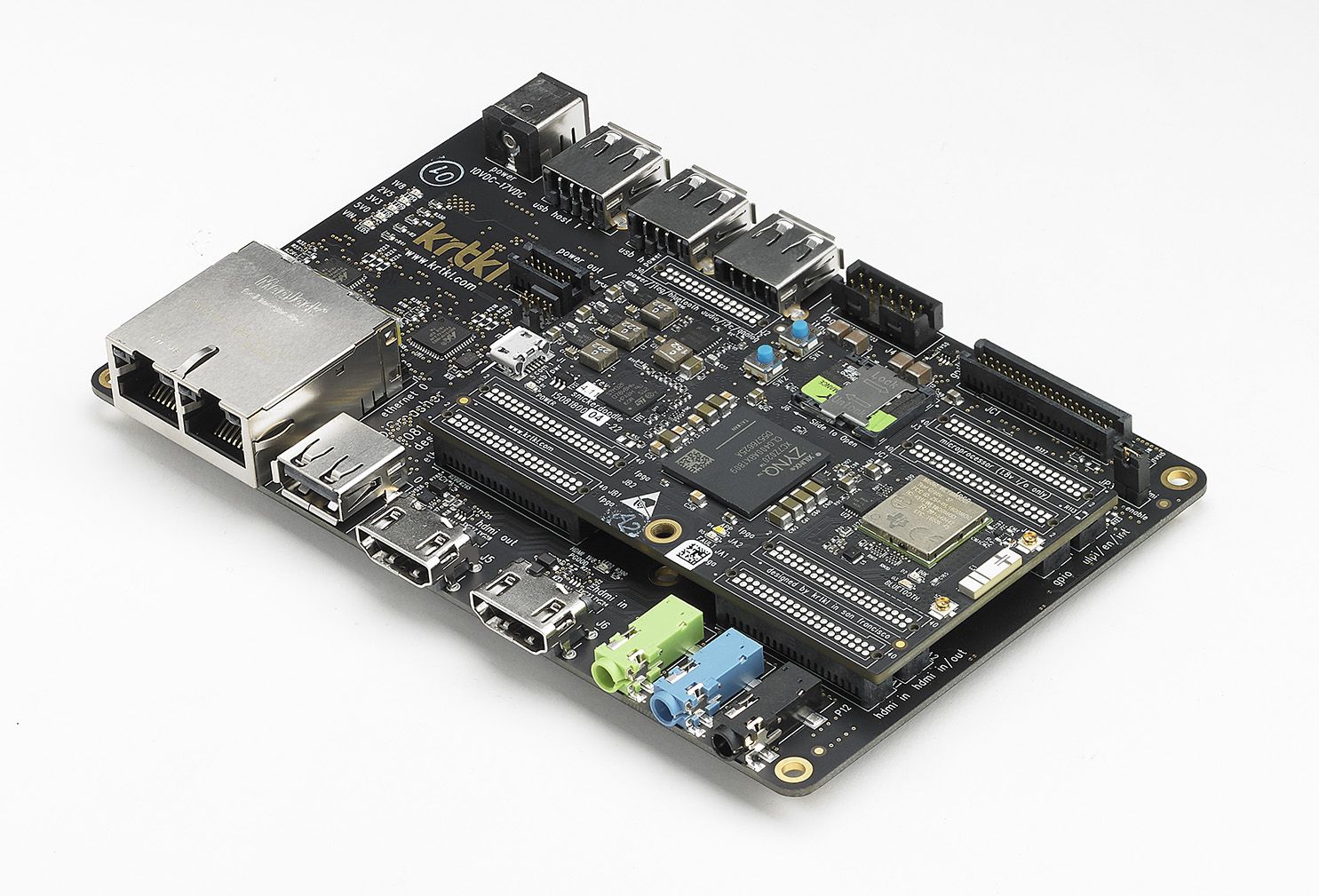 HDMI in AND out, 2x Gigabit Ethernet, 4x USB 2.0 high-speed, audio line in/out, headset, 25 reconfigurable I/O, DC power jack. Note: order your snickerdoodle connectors "down".