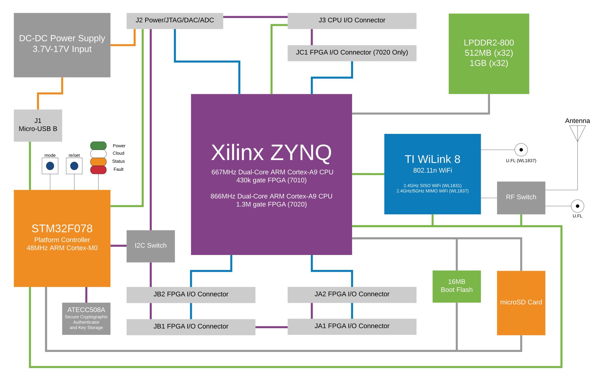 Dual-Core 866 MHz ARM Cortex-A9 w/1.3M ASIC gates, 180 reconfigurable I/O, 1 GB LPDDR2 RAM, 2.4 GHz + 5 GHz 802.11n 2x2 MIMO Wi-Fi, copperHead heat sink, free SDSoC license.