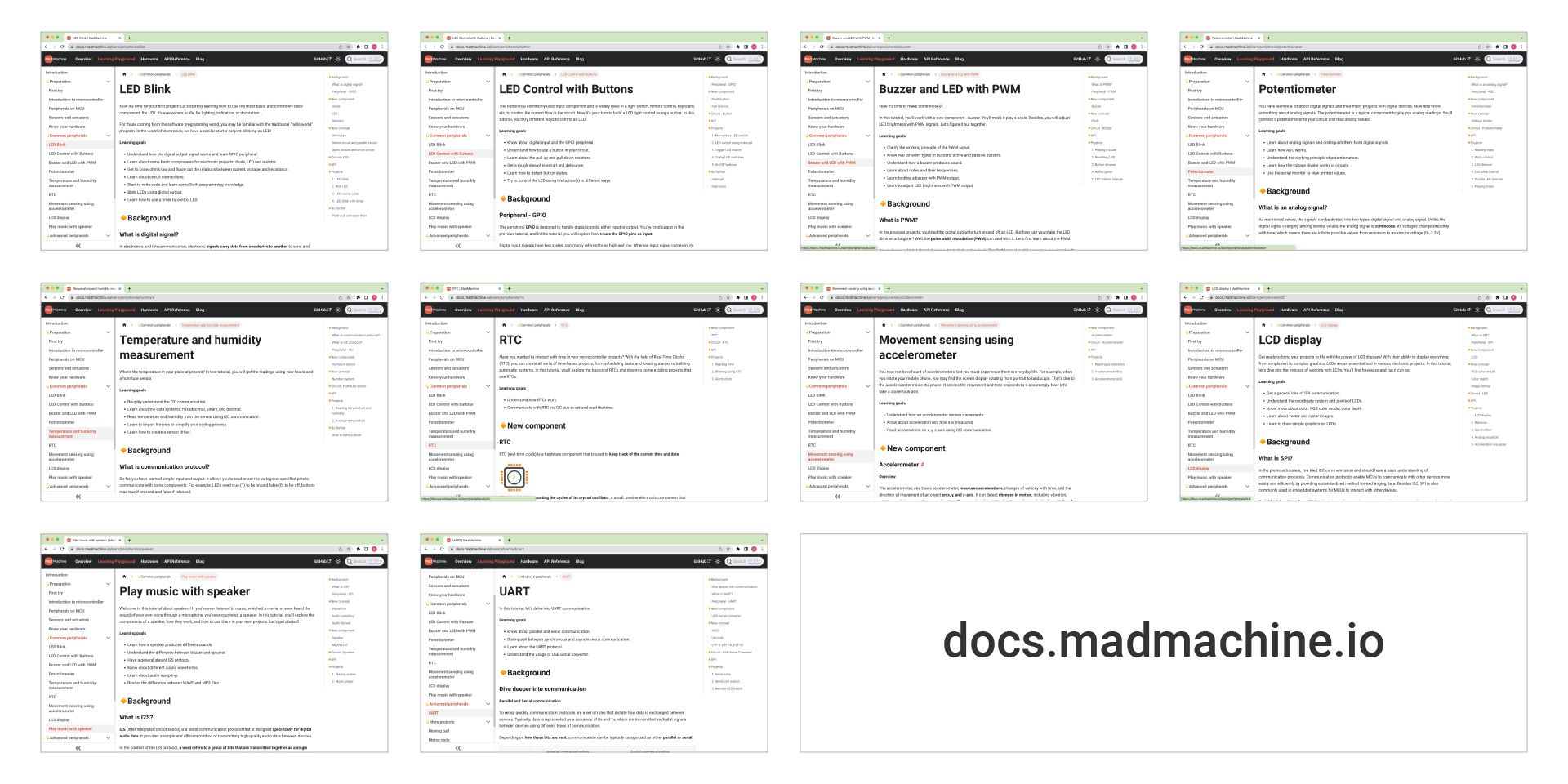 Our growing collection of detailed tutorials introduces electronics concepts and guides you through microcontroller programming basics. These guides facilitate learning about hardware while deepening your understanding of science, math, physics, and programming. Each module in the SwiftIO Playground kit has its dedicated tutorial, providing in-depth insights into the peripheral and its related concepts. This ensures that you have all the resources you need to explore and make the most out of each module’s functionalities.