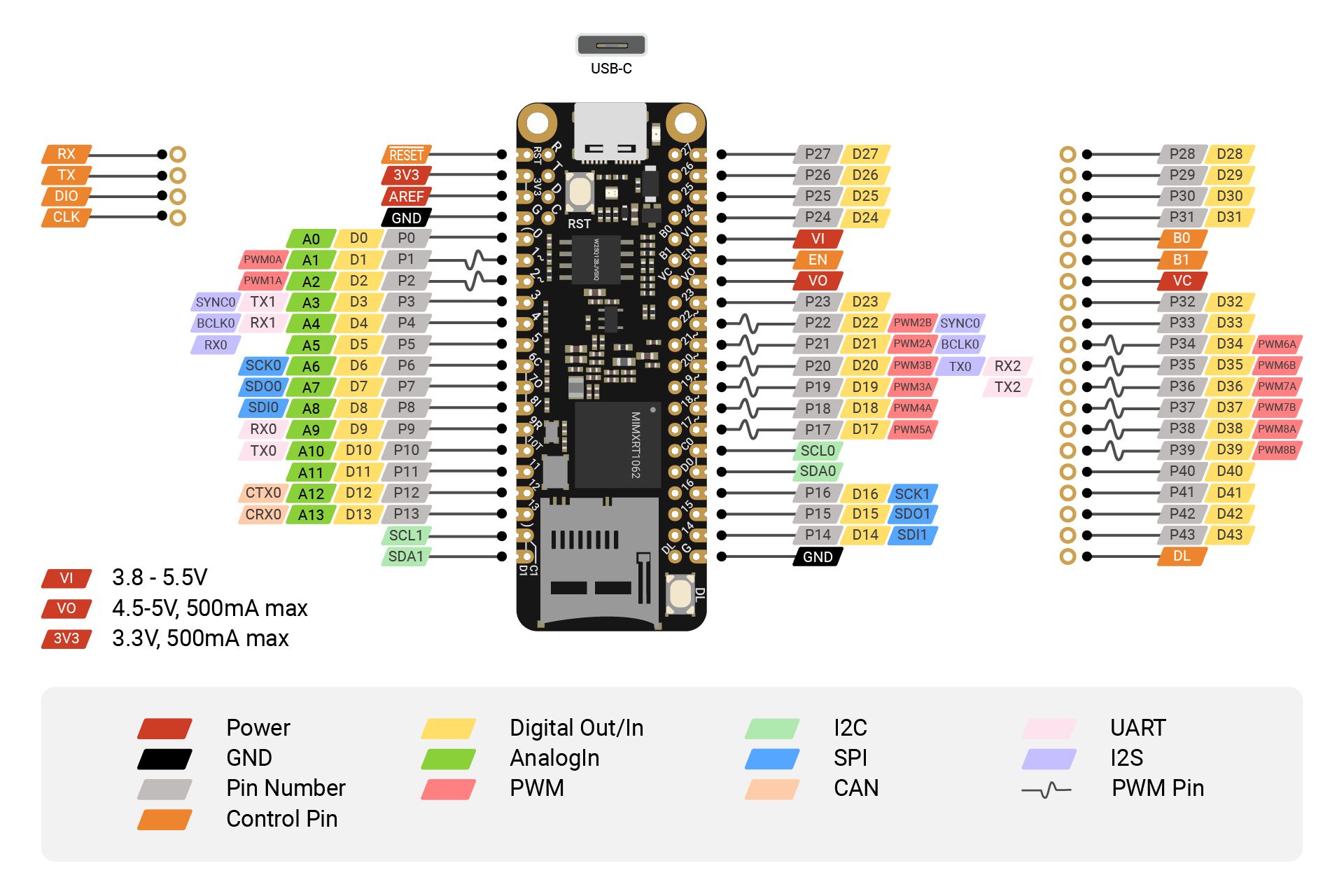 With 44 pins, including digital I/O, analog inputs, and PWM, UART, SPI, I²C and I²S interfaces, you can easily connect all kinds of devices: sensors, actuators, displays, communication modules, and other add-ons. SwiftIO gives you the flexibility to connect and control numerous devices simultaneously so you can design complex embedded systems.